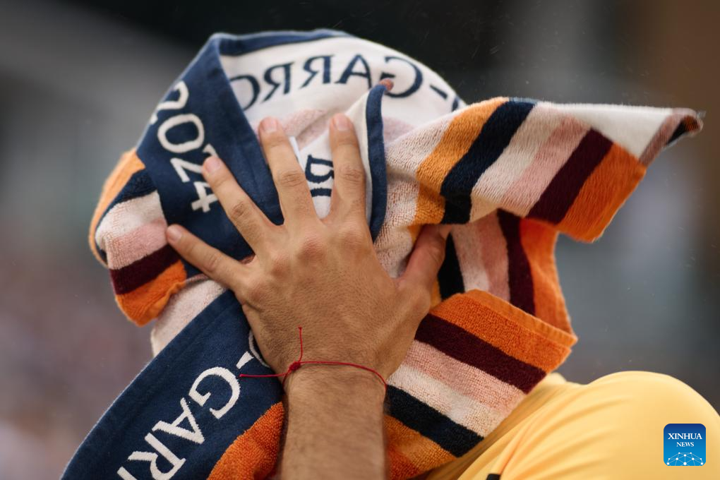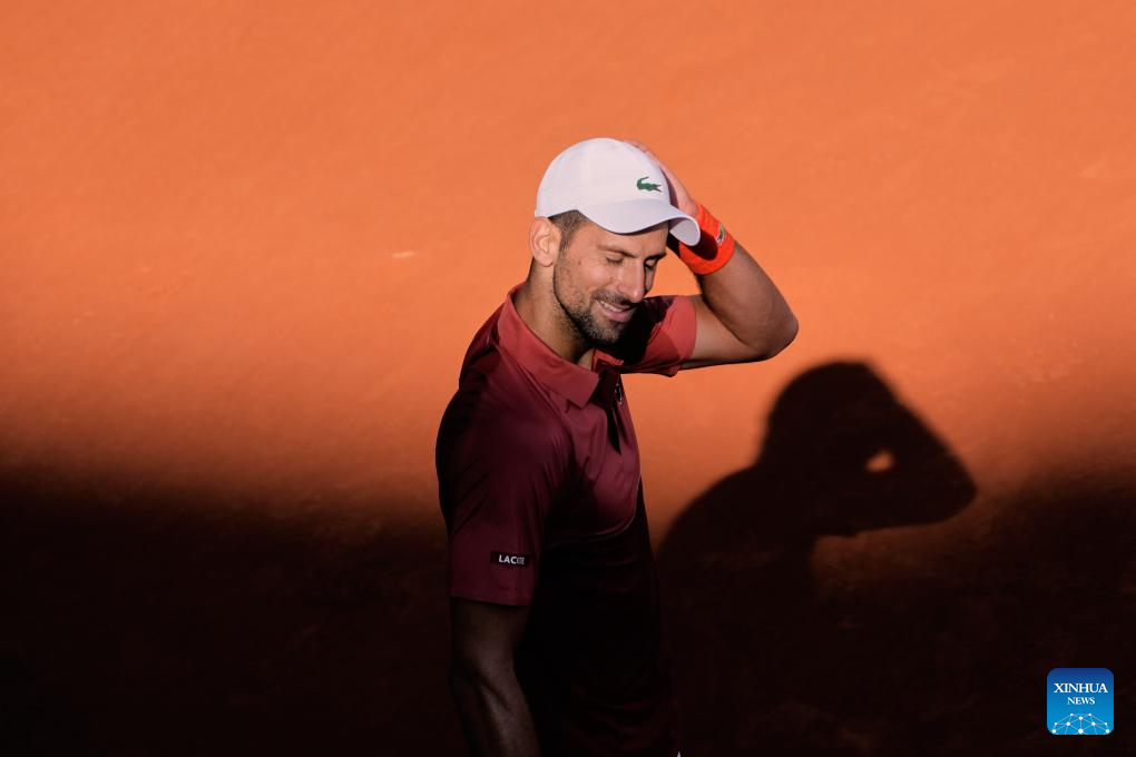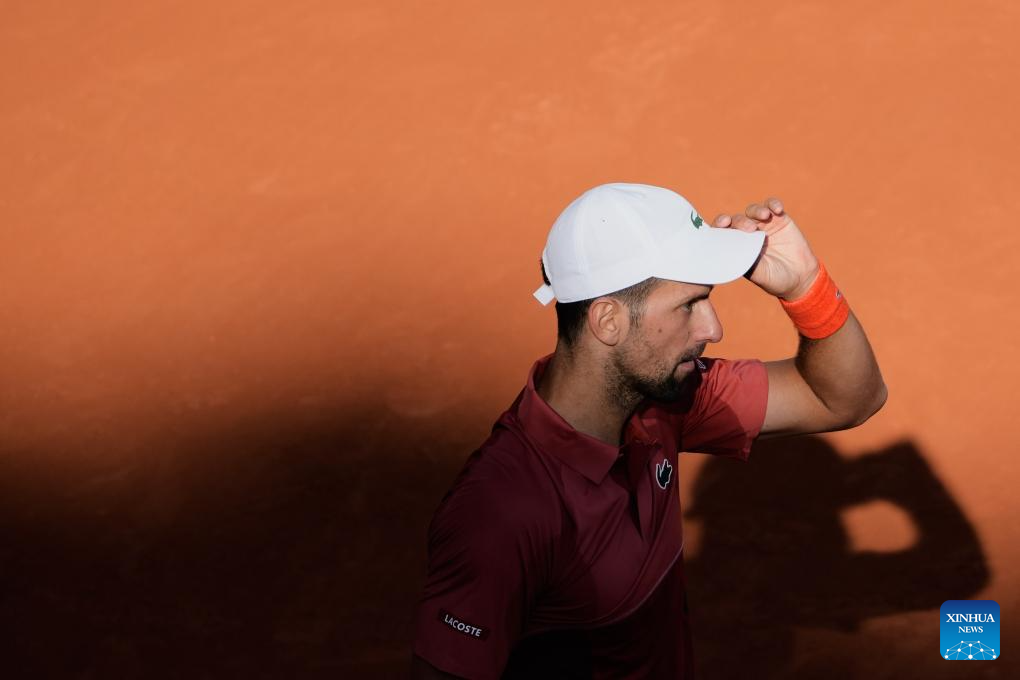 PARIS, 4 junio, 2024 (Xinhua) -- Imagen del 3 de junio de 2024 de Novak Djokovic reaccionando durante el partido de la cuarta ronda de individuales masculinos entre Novak Djokovic, de Serbia, y Francisco Cerúndolo, de Argentina, en el torneo de tenis Abierto de Francia en Roland Garros, en París, Francia. (Xinhua/Meng Dingbo)
