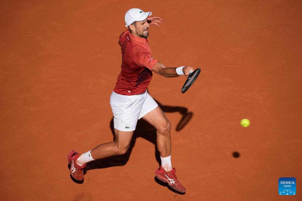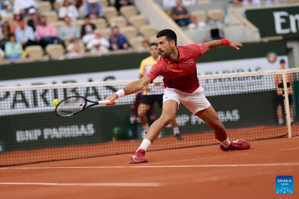PARIS, 4 junio, 2024 (Xinhua) -- Imagen del 3 de junio de 2024 de Novak Djokovic devolviendo la pelota durante el partido de la cuarta ronda de individuales masculinos entre Novak Djokovic, de Serbia, y Francisco Cerúndolo, de Argentina, en el torneo de tenis Abierto de Francia en Roland Garros, en París, Francia. (Xinhua/Meng Dingbo)