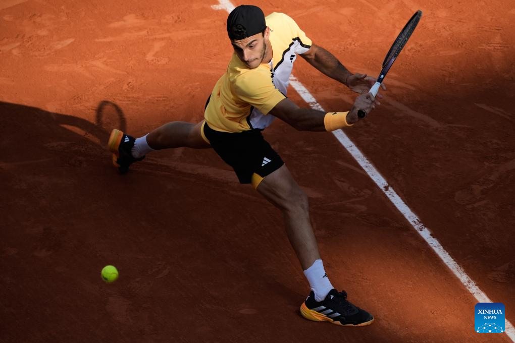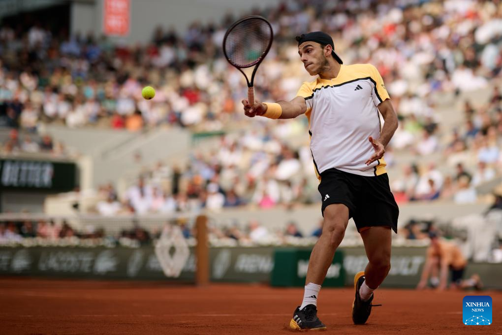PARIS, 4 junio, 2024 (Xinhua) -- Imagen del 3 de junio de 2024 de Francisco Cerúndolo devolviendo la pelota durante el partido de la cuarta ronda de individuales masculinos entre Novak Djokovic, de Serbia, y Francisco Cerúndolo, de Argentina, en el torneo de tenis Abierto de Francia en Roland Garros, en París, Francia. (Xinhua/Meng Dingbo)