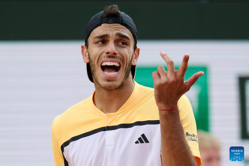 PARIS, 4 junio, 2024 (Xinhua) -- Imagen del 3 de junio de 2024 de Francisco Cerúndolo reaccionando durante el partido de la cuarta ronda de individuales masculinos entre Novak Djokovic, de Serbia, y Francisco Cerúndolo, de Argentina, en el torneo de tenis Abierto de Francia en Roland Garros, en París, Francia. (Xinhua/Meng Dingbo)