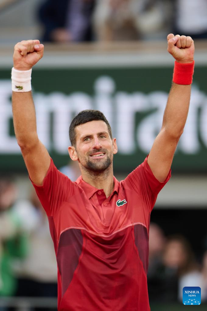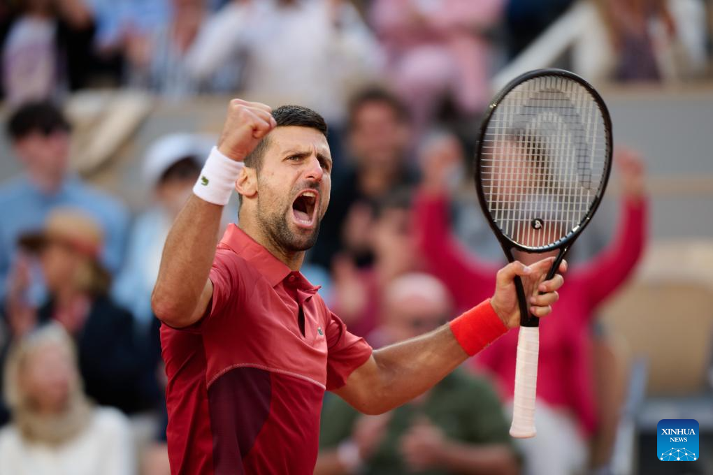 PARIS, 4 junio, 2024 (Xinhua) -- Imagen del 3 de junio de 2024 de Novak Djokovic festejando la victoria después del partido de la cuarta ronda de individuales masculinos entre Novak Djokovic, de Serbia, y Francisco Cerúndolo, de Argentina, en el torneo de tenis Abierto de Francia en Roland Garros, en París, Francia. (Xinhua/Meng Dingbo)