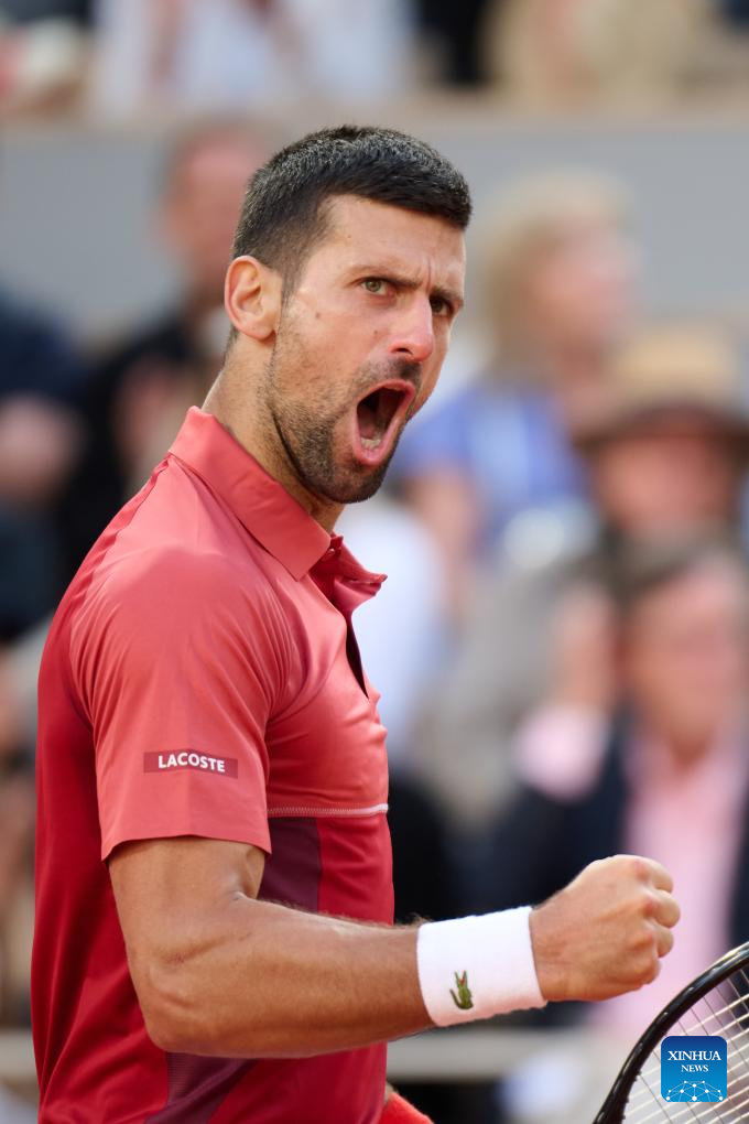 PARIS, 4 junio, 2024 (Xinhua) -- Imagen del 3 de junio de 2024 de Novak Djokovic festejando un punto durante el partido de la cuarta ronda de individuales masculinos entre Novak Djokovic, de Serbia, y Francisco Cerúndolo, de Argentina, en el torneo de tenis Abierto de Francia en Roland Garros, en París, Francia. (Xinhua/Meng Dingbo)