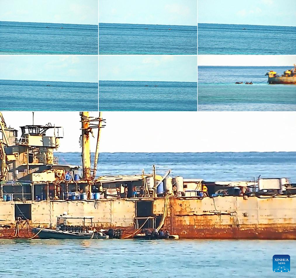 SANSHA, 4 junio, 2024 (Xinhua) -- Imagen combinada del 16 de mayo de 2024 del proceso del personal del buque de transporte de la marina filipina encallado ilegalmente cortando y robando las redes de los pescadores chinos, en Ren'ai Jiao y el mar territorial circundante. Recientemente, en Ren'ai Jiao de China y el mar territorial circundante, el personal del buque de transporte de la marina filipina Sierra Madre, encallado ilegalmente, dañó repetidamente las redes de los pescadores chinos. Se estima que más de 2.000 metros de redes de pesca han sido dañadas y más de 100 metros de redes de pesca han sido robadas por personal filipino del buque encallado ilegalmente desde el 15 de mayo de 2024. (Xinhua)