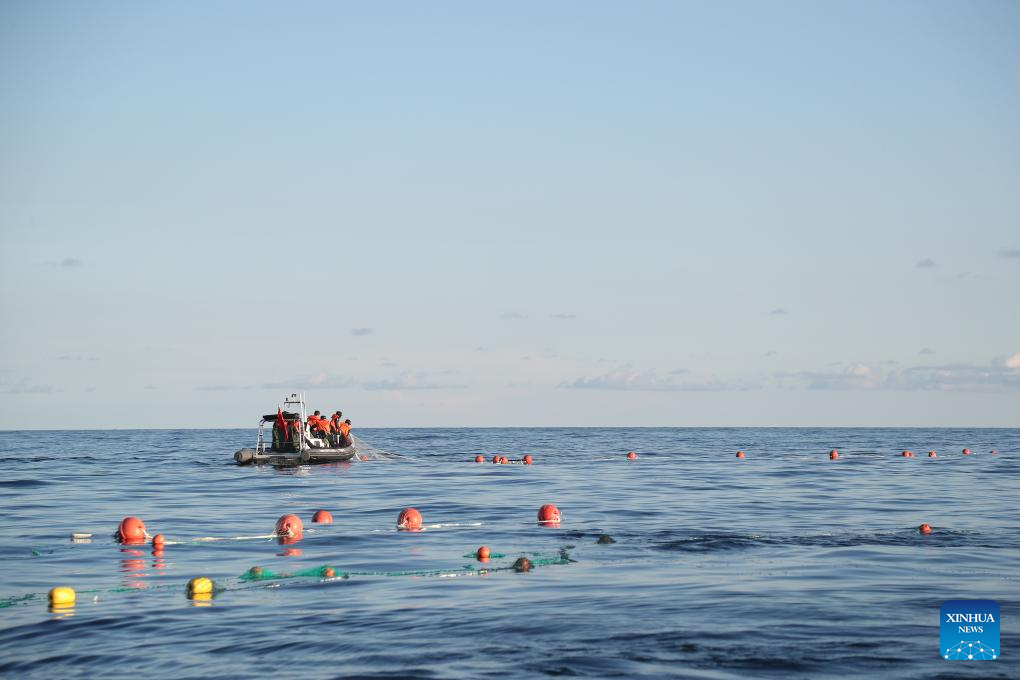 SANSHA, 4 junio, 2024 (Xinhua) -- Imagen del 15 de mayo de 2024 de redes de pescadores chinos esparcidas, dañadas por personal filipino, en Ren'ai Jiao y el mar territorial circundante. Recientemente, en Ren'ai Jiao de China y el mar territorial circundante, el personal del buque de transporte de la marina filipina Sierra Madre, encallado ilegalmente, dañó repetidamente las redes de los pescadores chinos. Se estima que más de 2.000 metros de redes de pesca han sido dañadas y más de 100 metros de redes de pesca han sido robadas por personal filipino del buque encallado ilegalmente desde el 15 de mayo de 2024. (Xinhua/Zhao Chenjie)