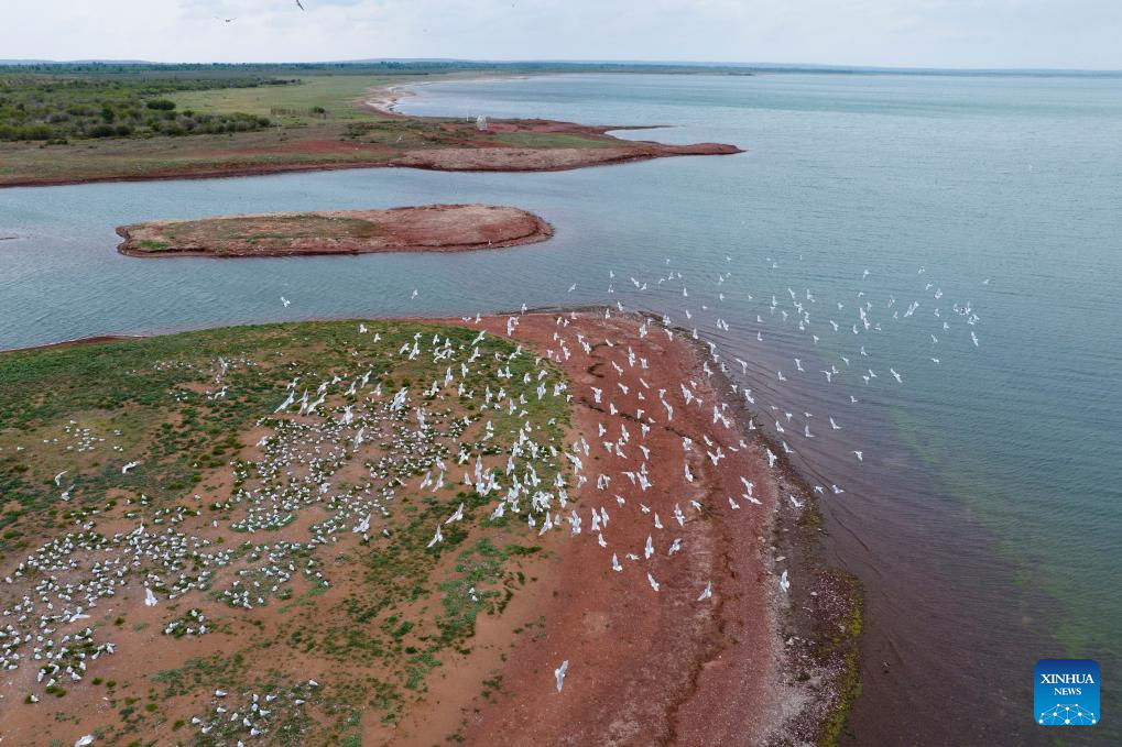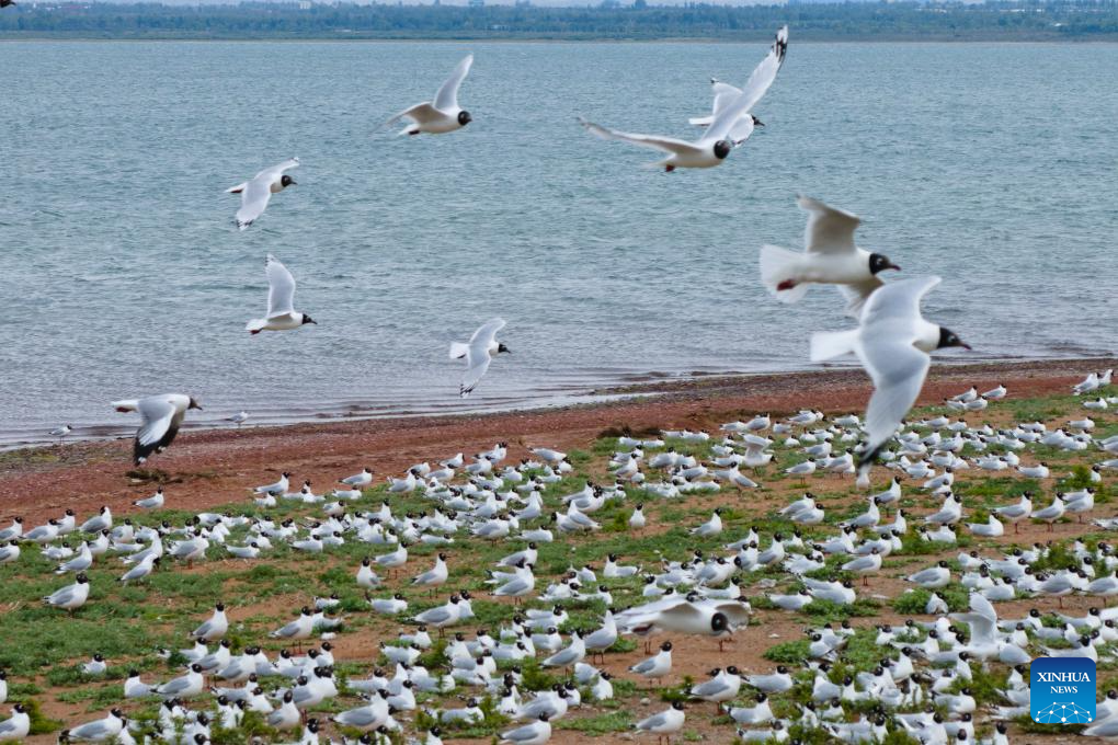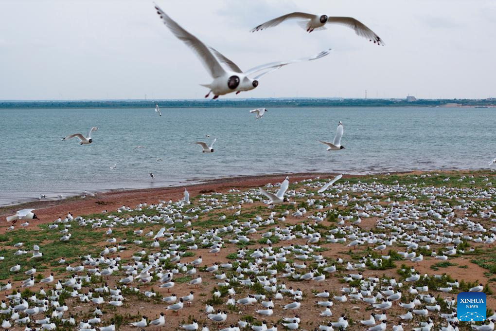 XI'AN, 5 junio, 2024 (Xinhua) -- Vista aérea tomada con un dron el 4 de junio de 2024 de gaviotas relictas en la Reserva Natural Nacional de Hongjiannao, en Shenmu, en la provincia de Shaanxi, en el noroeste de China. En la actualidad, casi 5.000 nidos de gaviotas relictas han entrado en el período de incubación y crianza en el lago Hongjiannao, el mayor lago desértico de agua dulce de China. Después de años de tratamiento, el lago ha recuperado vitalidad y se ha convertido en un importante hábitat y lugar de cría para la gaviota relicta, que se encuentra bajo protección nacional de primera clase en China. (Xinhua/Shao Rui)