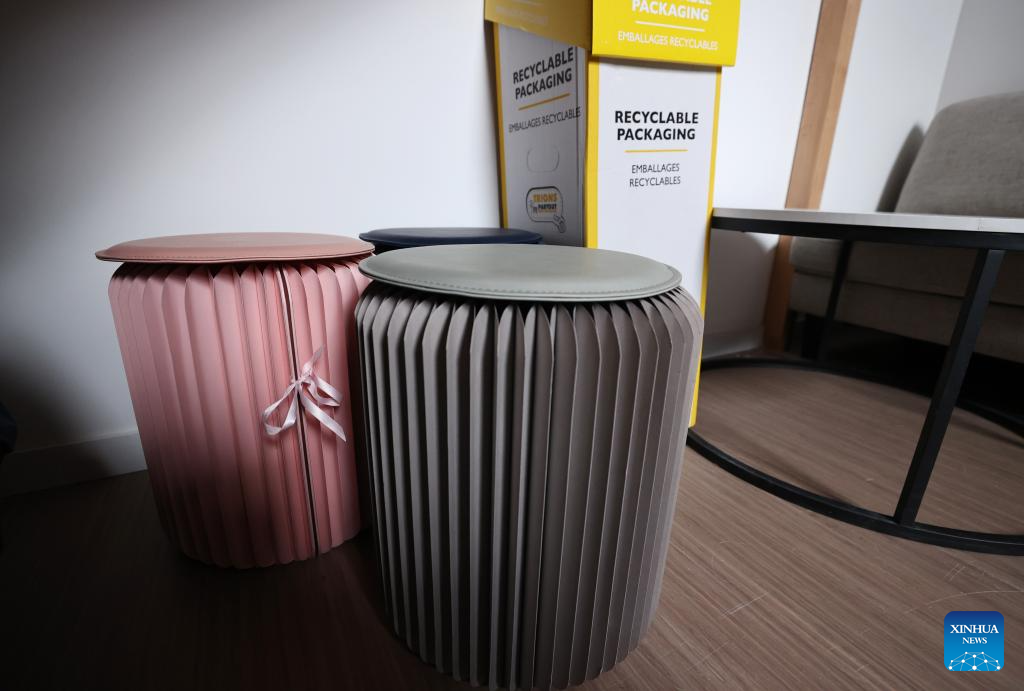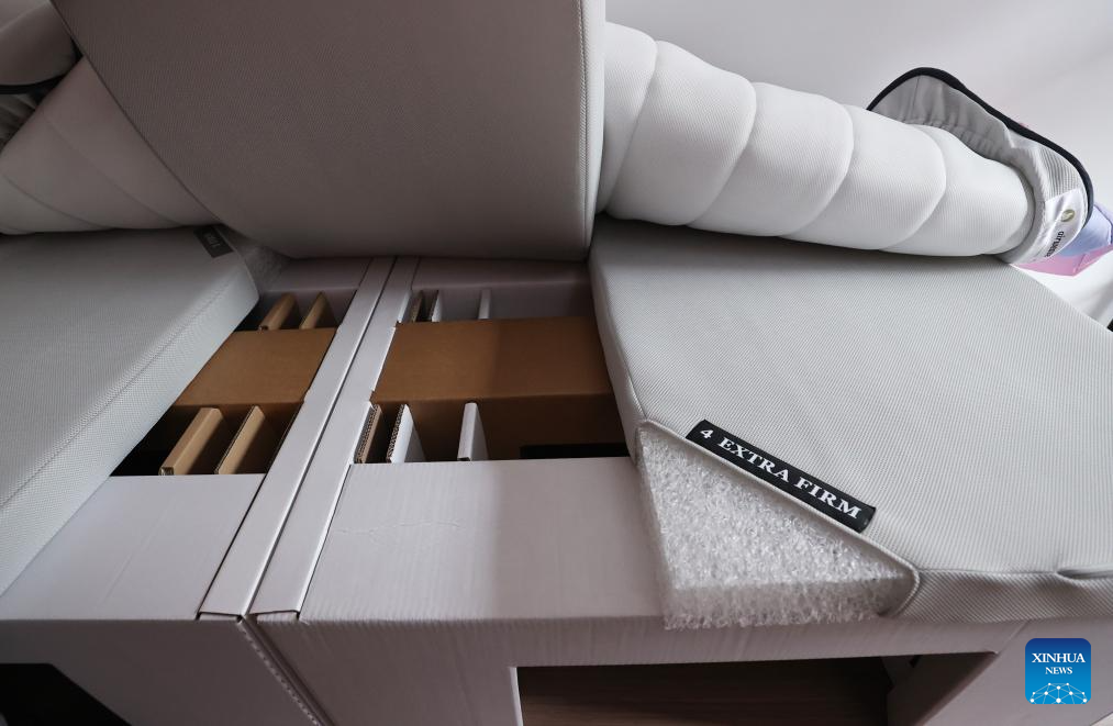 SAINT DENIS, 5 junio, 2024 (Xinhua) -- Imagen del 4 de junio de 2024 de colchones reciclables fabricados con red de pesca vistos en una habitación en la Villa Olímpica y Paralímpica de París 2024 durante una gira de prensa, en Saint Denis, cerca de París, Francia. (Xinhua/Gao Jing)