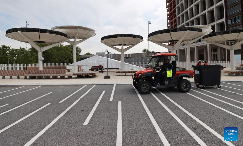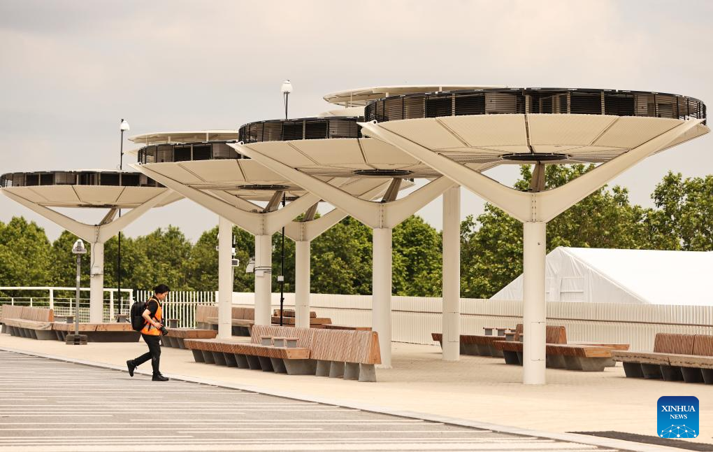 SAINT DENIS, 5 junio, 2024 (Xinhua) -- Imagen del 4 de junio de 2024 de un periodista caminando frente a instalaciones de purificación de aire en la Villa Olímpica y Paralímpica de París 2024 durante una gira de prensa, en Saint Denis, cerca de París, Francia. (Xinhua/Gao Jing)