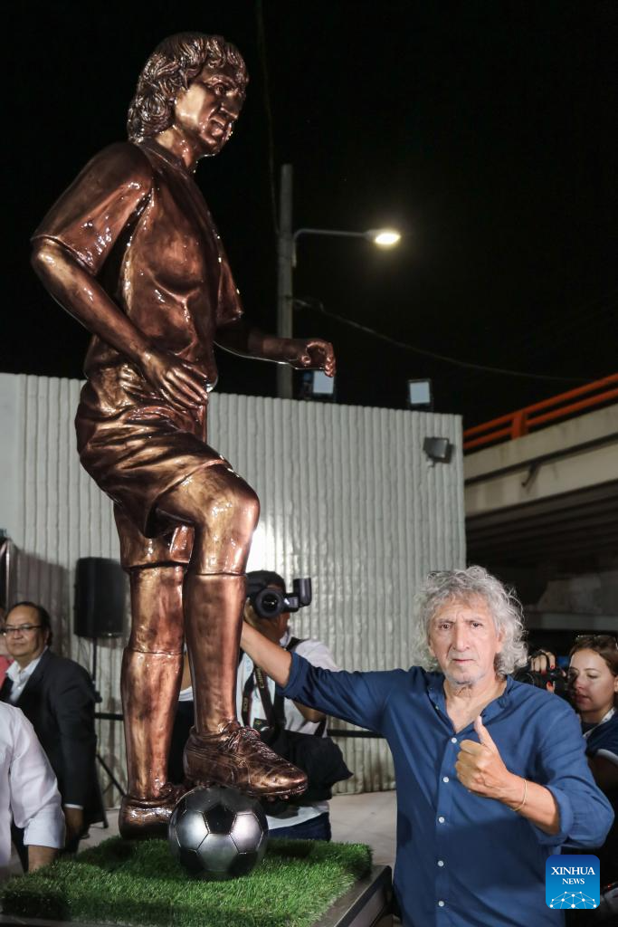 SAN SALVADOR, 5 junio, 2024 (Xinhua) -- Imagen del 4 de junio de 2024 del exfutbolista salvadoreño, Jorge "Mágico" González, develando una estatua con su imagen durante la inauguración de un museo dedicado a su trayectoria, en el Estadio Nacional Jorge "El Mágico" González, en el departamento de San Salvador, El Salvador. (Xinhua/Alexander Peña)