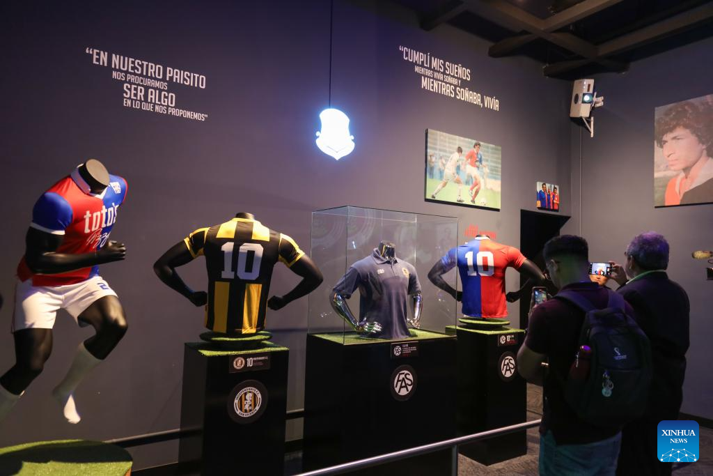 SAN SALVADOR, 5 junio, 2024 (Xinhua) -- Imagen del 4 de junio de 2024 de personas observando camisetas de fútbol históricas durante la inauguración del Museo de Jorge "El Mágico" González, dedicado a la trayectoria del exfutbolista salvadoreño, en el Estadio Nacional Jorge "El Mágico" González, en el departamento de San Salvador, El Salvador. (Xinhua/Alexander Peña)