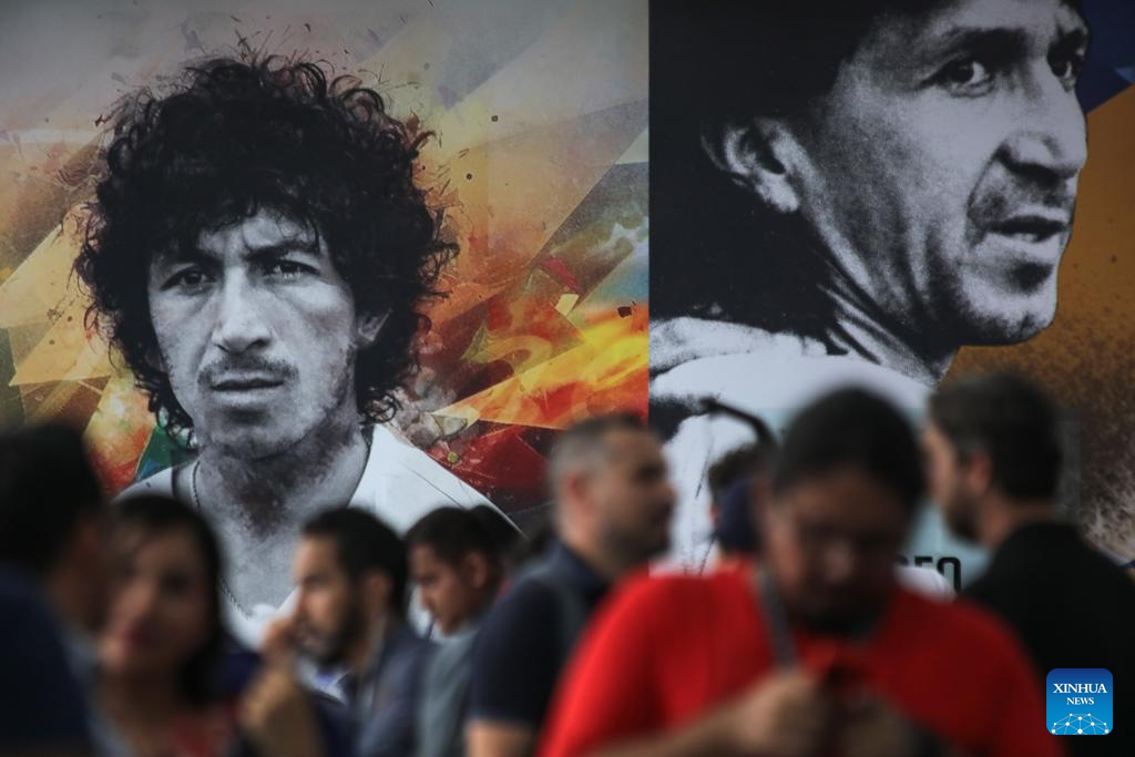 SAN SALVADOR, 5 junio, 2024 (Xinhua) -- Imagen del 4 de junio de 2024 de personas caminando frente a pinturas del ex futbolista salvadoreño, Jorge "El Mágico" González, durante la inauguración de un museo dedicado a su trayectoria, en el Estadio Nacional Jorge "El Mágico" González, en el departamento de San Salvador, El Salvador. (Xinhua/Alexander Peña)