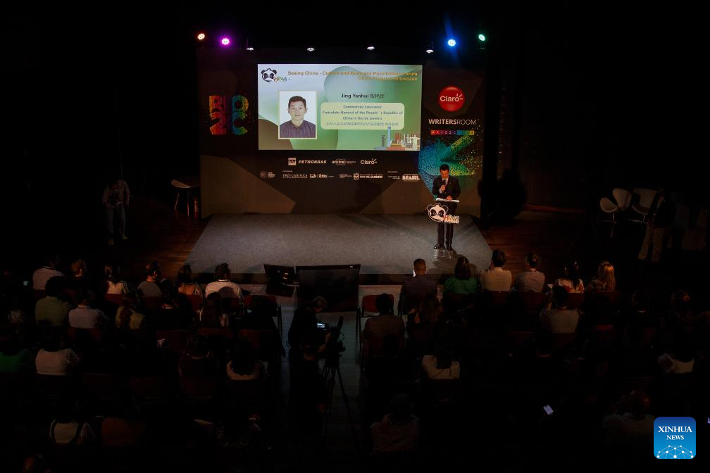 RIO DE JANEIRO, 6 junio, 2024 (Xinhua) -- Leo Geng (d-atrás), vicepresidente senior del servicio chino de transmisión de video iQIYI, Inc., habla durante el Foro "Viendo a China-Cultura y Posibilidades de Negocio" en la RIO2C 2024 (Conferencia Creativa de Río) llevada a cabo en la Ciudad de las Artes, en Río de Janeiro, Brasil, el 6 de junio de 2024. (Xinhua/Claudia Martini)