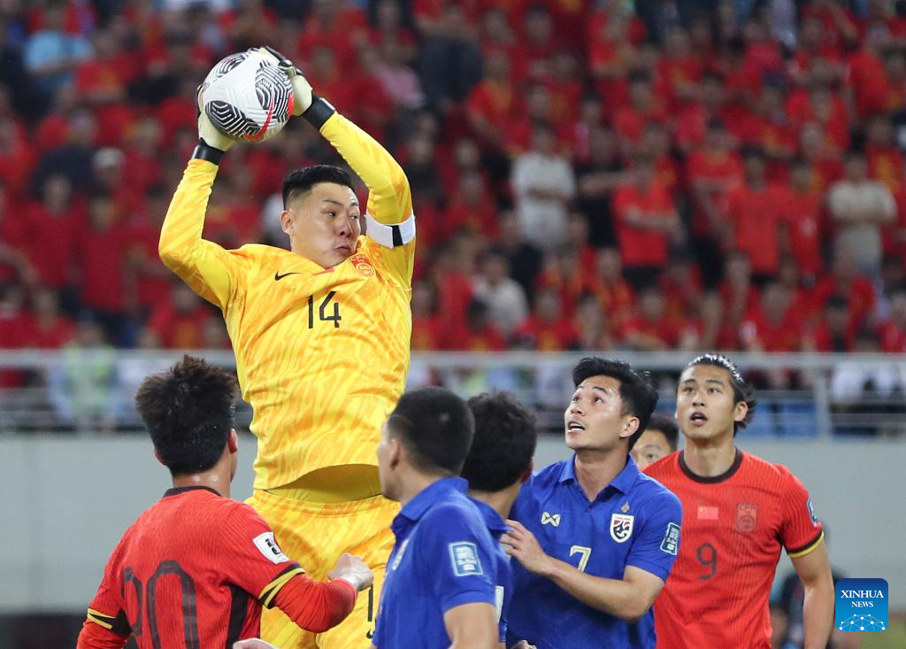 SHENYANG, 6 junio, 2024 (Xinhua) -- El guardameta Wang Dalei (arriba), de China, ataja el balón durante el partido correspondiente al Grupo C de las Eliminatorias de Asia para la Copa Mundial de la FIFA 2026, entre China y Tailandia, en Shenyang, en la provincia de Liaoning, en el noreste de China, el 6 de junio de 2024. (Xinhua/Jia Haocheng)