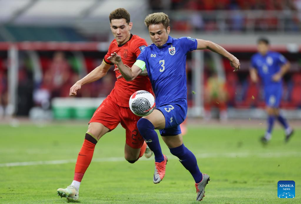 SHENYANG, 6 junio, 2024 (Xinhua) -- El jugador Behram Abduweli (i), de China, disputa el balón con Theerathon Bunmathan, de Tailandia, durante el partido correspondiente al Grupo C de las Eliminatorias de Asia para la Copa Mundial de la FIFA 2026, entre China y Tailandia, en Shenyang, en la provincia de Liaoning, en el noreste de China, el 6 de junio de 2024. (Xinhua/Li Gang)
