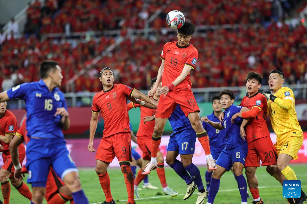 SHENYANG, 6 junio, 2024 (Xinhua) -- El jugador A Lan (c), de China, disputa el balón con Suphan Thongsong, de Tailandia, durante el partido correspondiente al Grupo C de las Eliminatorias de Asia para la Copa Mundial de la FIFA 2026, entre China y Tailandia, en Shenyang, en la provincia de Liaoning, en el noreste de China, el 6 de junio de 2024. (Xinhua/Pan Yulong)