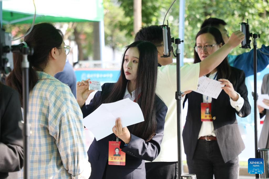 LANZHOU, 7 junio, 2024 (Xinhua) -- Aspirantes pasan por un control de sus documentos de identidad previo a entrar en un sitio del examen nacional de ingreso a la universidad, en Lanzhou, en la provincia de Gansu, en el noroeste de China, el 7 de junio de 2024. El examen nacional de ingreso a la universidad de China, conocido como Gaokao, comenzó el viernes. (Xinhua/Ma Xiping)