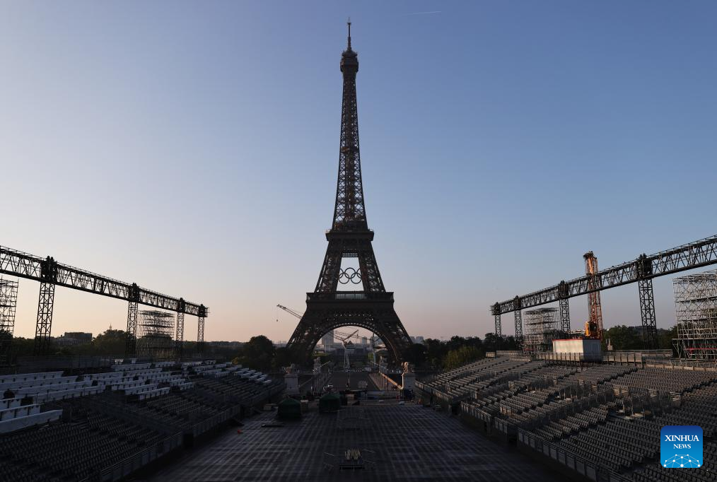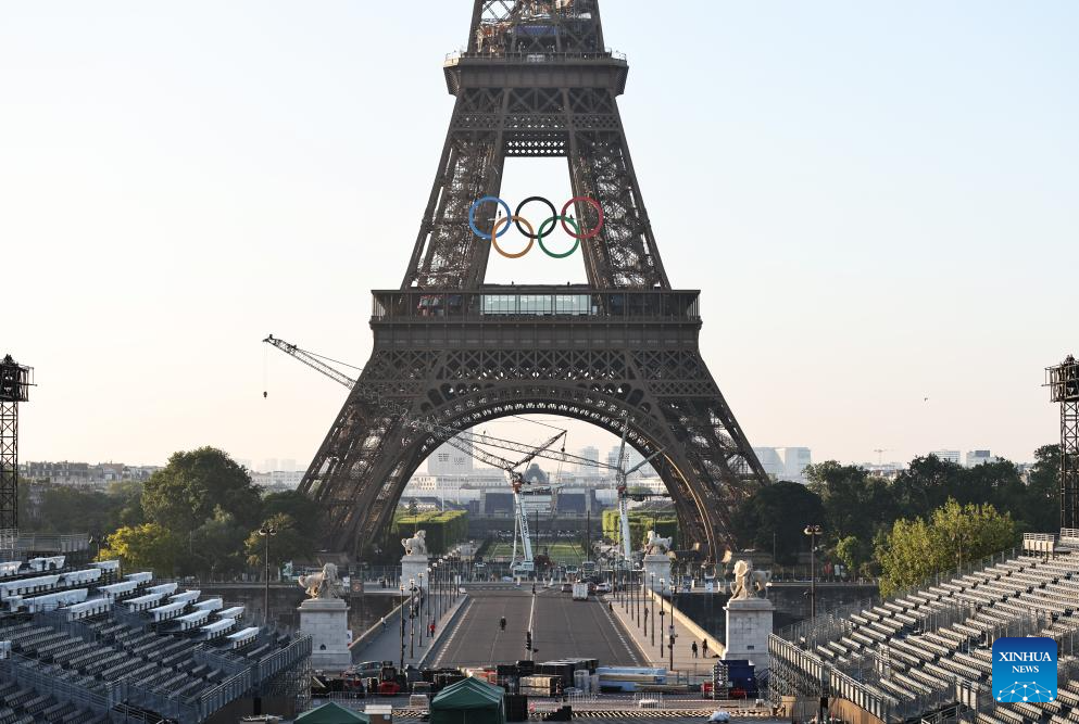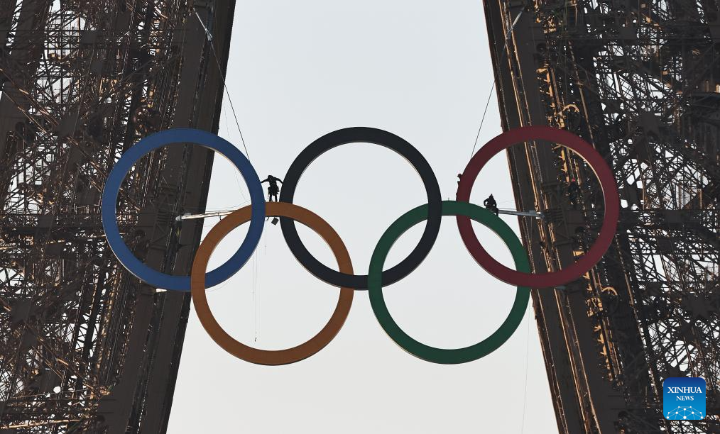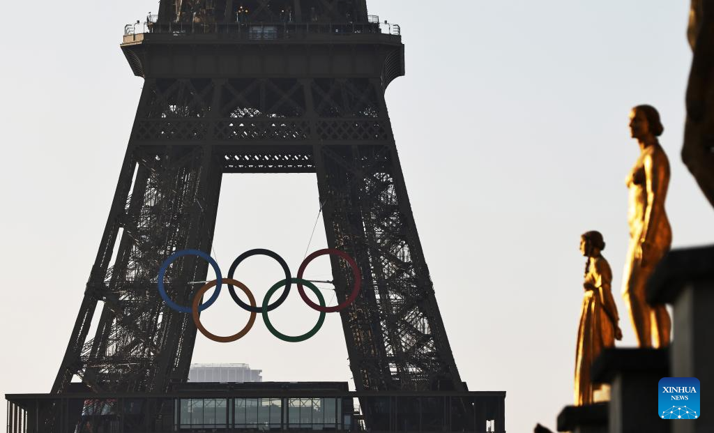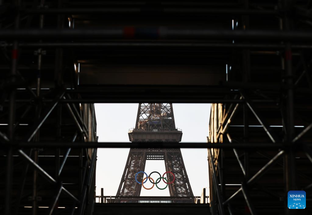 PARIS, 7 junio, 2024 (Xinhua) -- Los anillos olímpicos son vistos en la Torre Eiffel, en París, Francia, el 7 de junio de 2024. Los anillos olímpicos son develados en la Torre Eiffel a primera hora de la mañana del viernes mientras la capital francesa marca 50 días para el inicio de los próximos Juegos Olímpicos de París 2024. (Xinhua/Gao Jing)