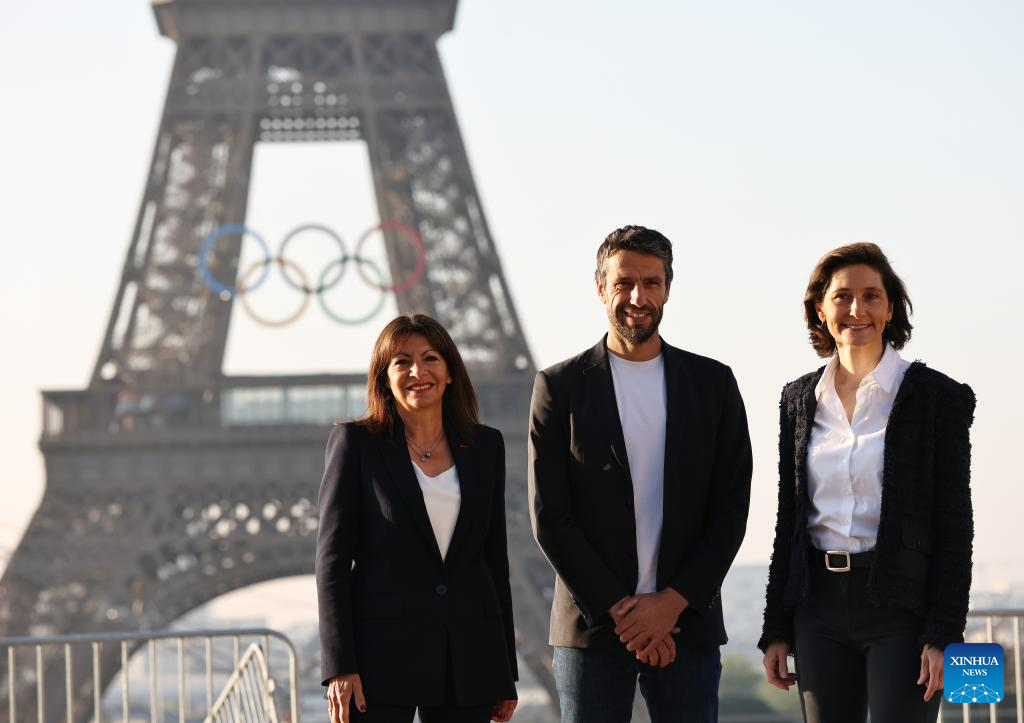 PARIS, 7 junio, 2024 (Xinhua) -- La ministra de Deporte de Francia, Amelie Oudea-Castera (d), el presidente del Comité Organizador de los Juegos Olímpicos de París 2024, Tony Estanguet (c), y la alcaldesa de París, Anne Hidalgo, posan con los anillos olímpicos en la Torre Eiffel, en París, Francia, el 7 de junio de 2024. Los anillos olímpicos son develados en la Torre Eiffel a primera hora de la mañana del viernes mientras la capital francesa marca 50 días para el inicio de los próximos Juegos Olímpicos de París 2024. (Xinhua/Gao Jing)