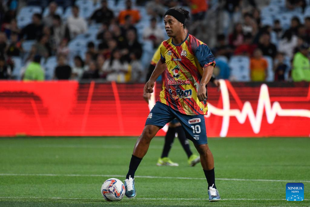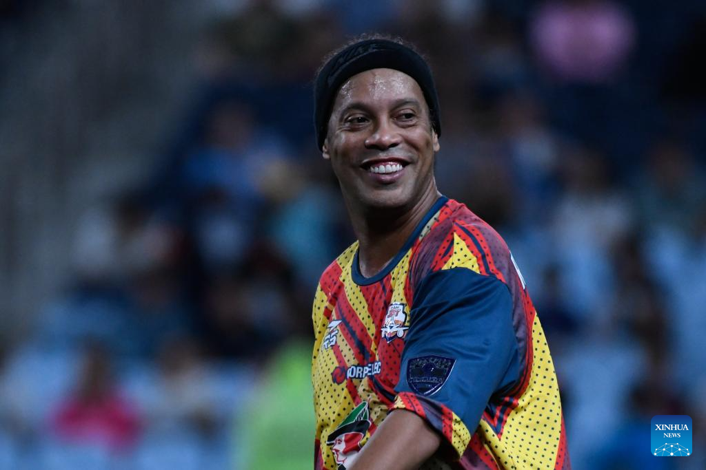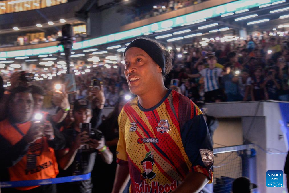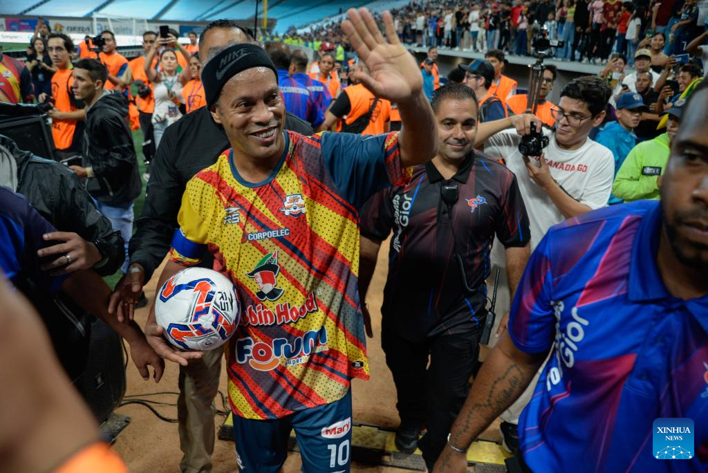 CARACAS, 7 junio, 2024 (Xinhua) -- Imagen del 6 de junio de 2024 del exfutbolista brasileño, Ronaldinho (c), de Forum Jet, saludando a los aficionados al término del partido correspondiente a la Liga Monumental de Venezuela, ante Vikingos del Caribe, celebrado en el Estadio Monumental de Caracas Simón Bolívar, en Caracas, Venezuela. (Xinhua/Marcos Salgado)
