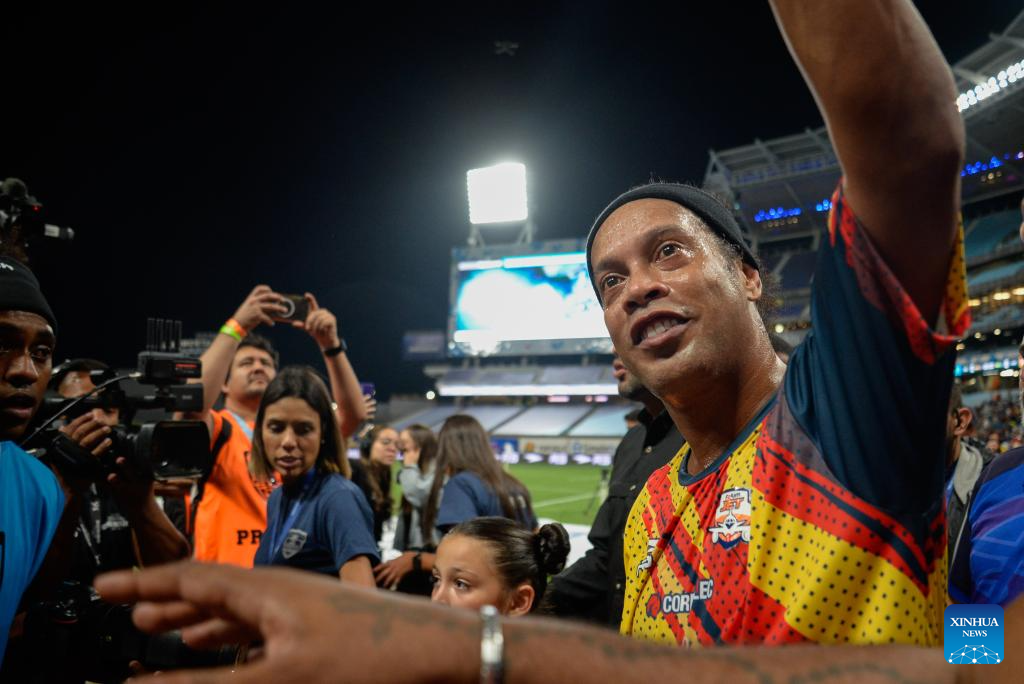 CARACAS, 7 junio, 2024 (Xinhua) -- Imagen del 6 de junio de 2024 del exfutbolista brasileño, Ronaldinho (frente), de Forum Jet, saludando a los aficionados al término del partido correspondiente a la Liga Monumental de Venezuela, ante Vikingos del Caribe, celebrado en el Estadio Monumental de Caracas Simón Bolívar, en Caracas, Venezuela. (Xinhua/Marcos Salgado)