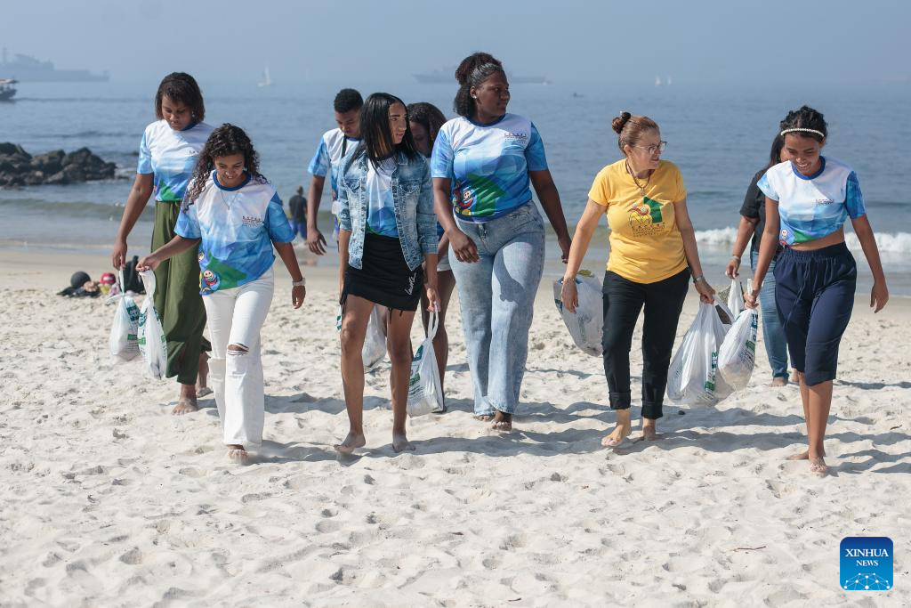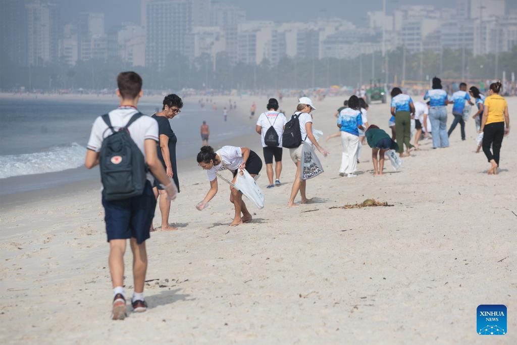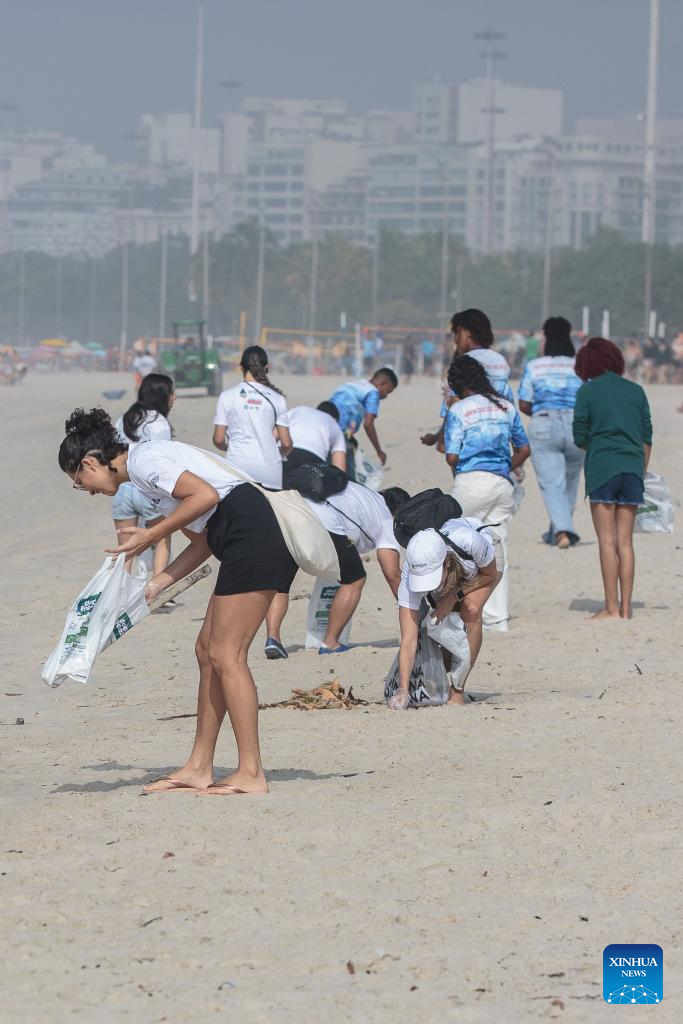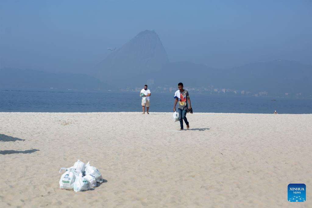 RÍO DE JANEIRO, 8 junio, 2024 (Xinhua) -- Voluntarios participan en la limpieza de la playa de Flamengo en el marco del Día Mundial de los Océanos, en Río de Janeiro, Brasil, el 8 de junio de 2024. (Xinhua/Claudia Martini)