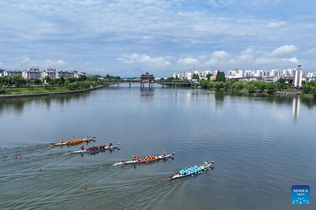 BEIJING, 8 junio, 2024 (Xinhua) -- Vista aérea tomada con un dron el 8 de junio de 2024 de equipos compitiendo durante una carrera de botes del dragón, en la ciudad de Huangshan, en la provincia de Anhui, en el este de China. Para celebrar el próximo Duanwu, o Festival del Bote del Dragón, se celebraron carreras de botes del dragón en varios lugares en China. El festival se celebra el quinto día del quinto mes del calendario lunar chino para conmemorar al antiguo poeta chino, Qu Yuan, del Período de los Reinos Combatientes (475-221 a.C.). (Xinhua/Fan Chengzhu)