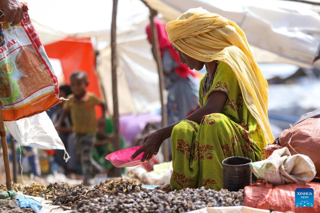 ADIS ABEBA, 7 junio, 2024 (Xinhua) -- Imagen del 27 de mayo de 2024 de una vendedora manipulando sus productos en un mercado, en Bati, Etiopía. (Xinhua/Michael Tewelde)