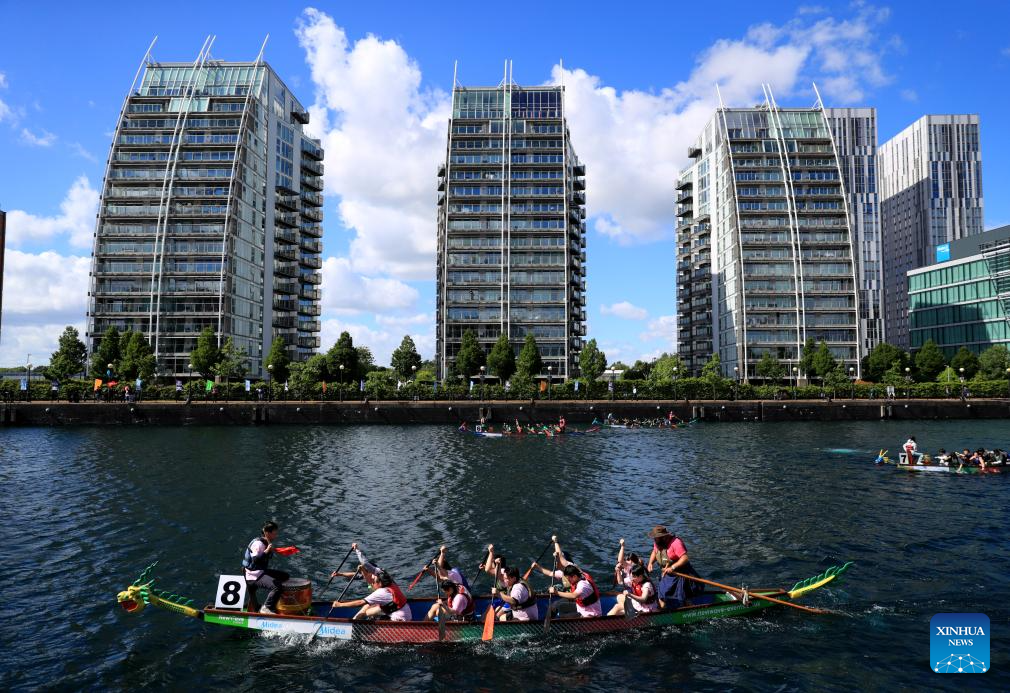 SALFORD, 9 junio, 2024 (Xinhua) -- Imagen del 8 de junio de 2024 de equipos compitiendo durante el Festival Chino del Bote del Dragón, en Salford, Reino Unido. (Xinhua/Li Ying)