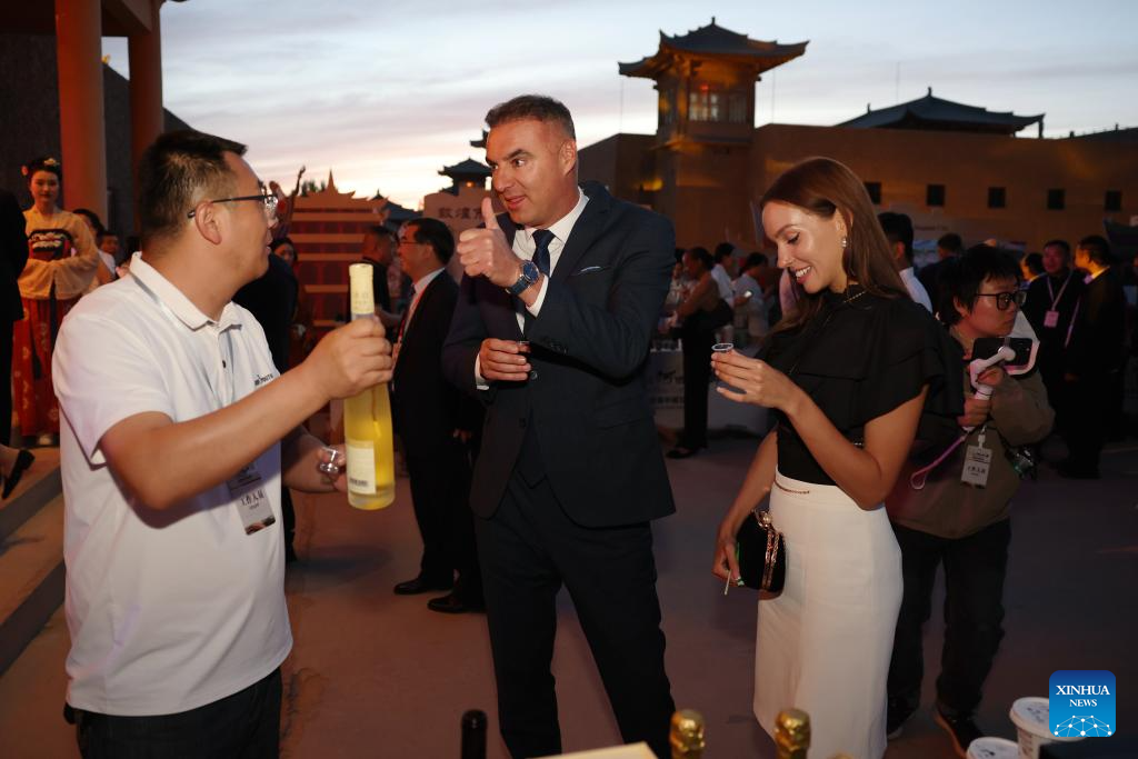 DUNHUANG, 7 junio, 2024 (Xinhua) -- Imagen del 6 de junio de 2024 de enviados catando vino en un evento que promueve el corredor de Hexi, en Dunhuang, en la provincia de Gansu, en el noroeste de China. Los enviados de varios países elogiaron los esfuerzos de China por desarrollar tecnologías de energía limpia y perseguir el desarrollo ecológico durante su visita a la provincia de Gansu, en el noroeste de China. Una delegación de embajadores y diplomáticos de alto nivel de más de 20 países, incluidos Madagascar, Jordania, Nepal y Eslovaquia, comenzó su visita el miércoles en Lanzhou, la capital provincial, y viajó el jueves a Dunhuang, una parada importante en la antigua Ruta de la Seda. (Xinhua/Chen Bin)