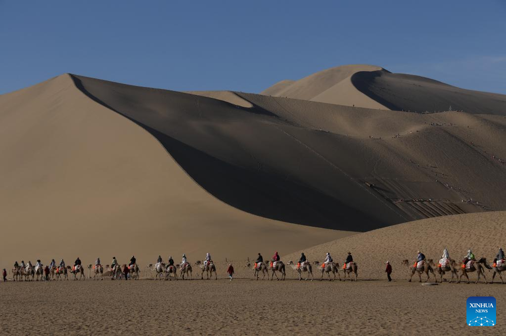BEIJING, 9 junio, 2024 (Xinhua) -- Turistas visitan la montaña Mingsha y el punto escénico de la Primavera Creciente, en Dunhuang, en la provincia de Gansu, en el noroeste de China, el 9 de junio de 2024. Personas disfrutan de los 3 días de vacaciones por el Festival del Bote del Dragón, también llamado Festival Duanwu, que cae el 10 de junio este año, a través de diversas actividades en todo el país. (Xinhua/Zhang Xiaoliang)