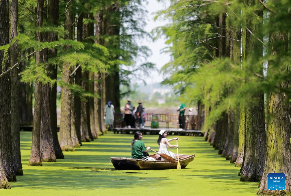 BEIJING, 9 junio, 2024 (Xinhua) -- Turistas reman en botes en el parque del Humedal del Lago Luyang, en Yangzhou, en la provincia de Jiangsu, en el este de China, el 9 de junio de 2024. Personas disfrutan de los 3 días de vacaciones por el Festival del Bote del Dragón, también llamado Festival Duanwu, que cae el 10 de junio este año, a través de diversas actividades en todo el país. (Xinhua/Meng Delong)