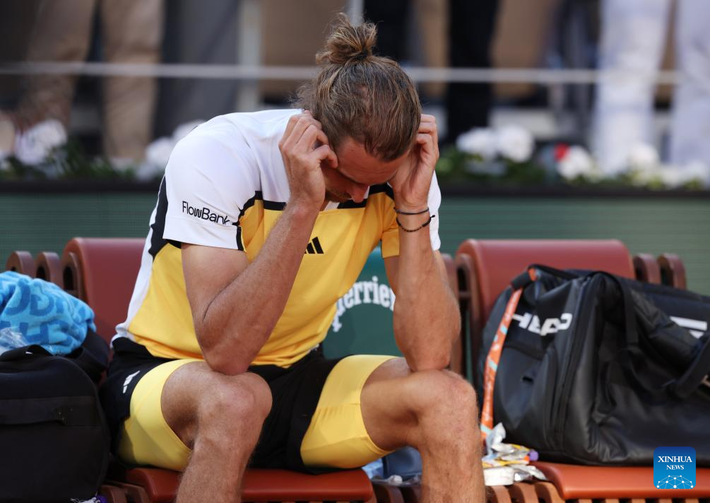 Imagen del 9 de junio de 2024 de Alexander Zverev reaccionando después del partido de la final de individuales masculinos entre Carlos Alcaraz, de España, y Alexander Zverev, de Alemania, en el torneo de tenis Abierto de Francia en Roland Garros, en París, Francia. (Xinhua/Gao Jing)