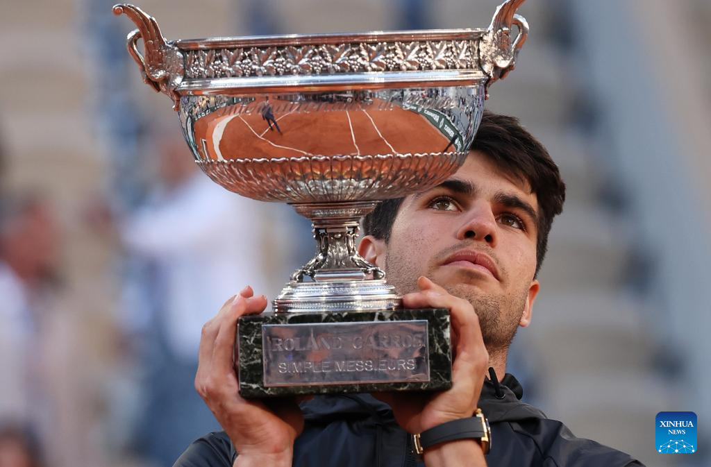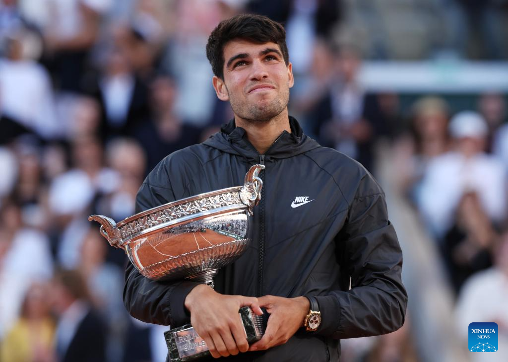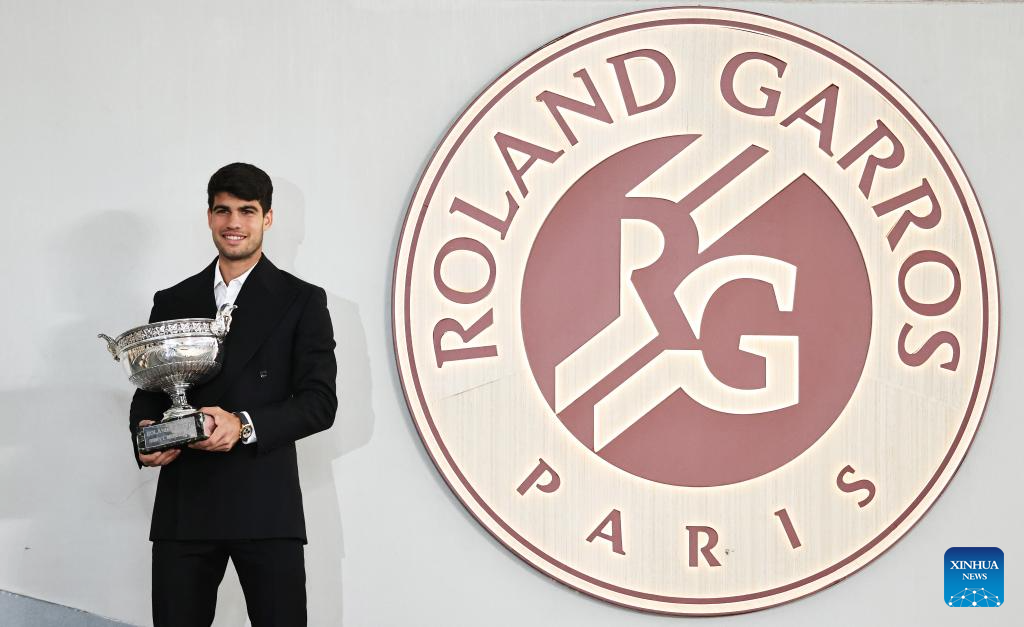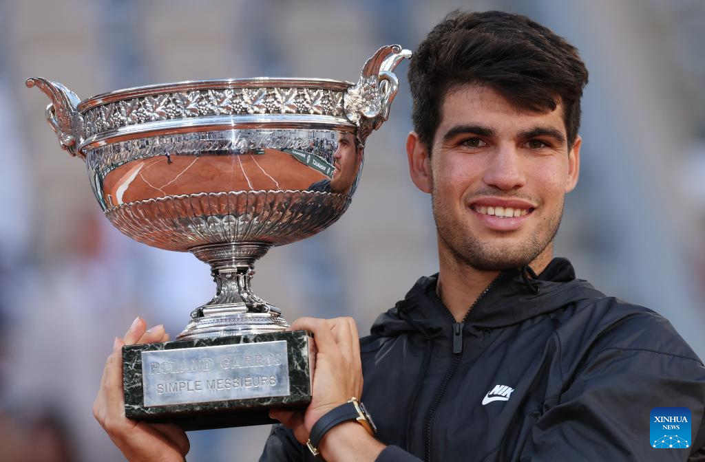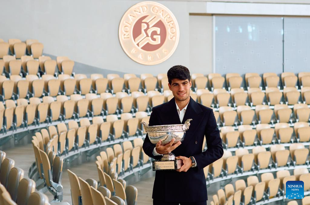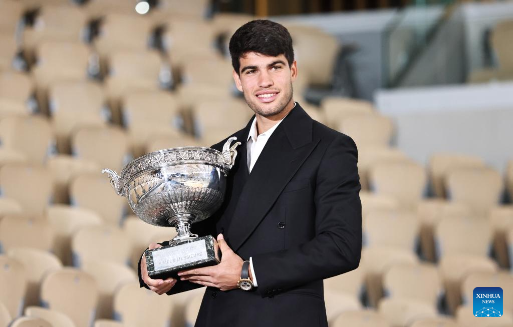 PARIS, 10 junio, 2024 (Xinhua) -- El español Carlos Alcaraz es visto un día después de ganar la final de individuales masculinos del torneo de tenis Abierto de Francia, en París, Francia, el 10 de junio de 2024. (Xinhua/Gao Jing)
