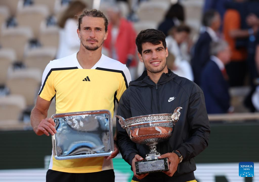 PARIS, 10 junio, 2024 (Xinhua) -- Imagen del 9 de junio de 2024 de Carlos Alcaraz (d), posando junto a Alexander Zverev durante la ceremonia de premiación después del partido de la final de individuales masculinos entre Carlos Alcaraz, de España, y Alexander Zverev, de Alemania, en el torneo de tenis Abierto de Francia en Roland Garros, en París, Francia. (Xinhua/Gao Jing)