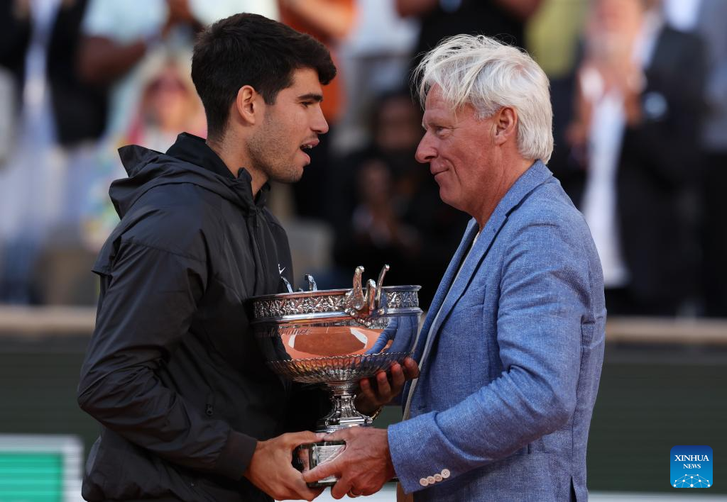 PARIS, 10 junio, 2024 (Xinhua) -- Imagen del 9 de junio de 2024 del extenista sueco, Bjorn Borg (d), entregando el trofeo a Carlos Alcaraz durante la ceremonia de premiación después del partido de la final de individuales masculinos entre Carlos Alcaraz, de España, y Alexander Zverev, de Alemania, en el torneo de tenis Abierto de Francia en Roland Garros, en París, Francia. (Xinhua/Gao Jing)