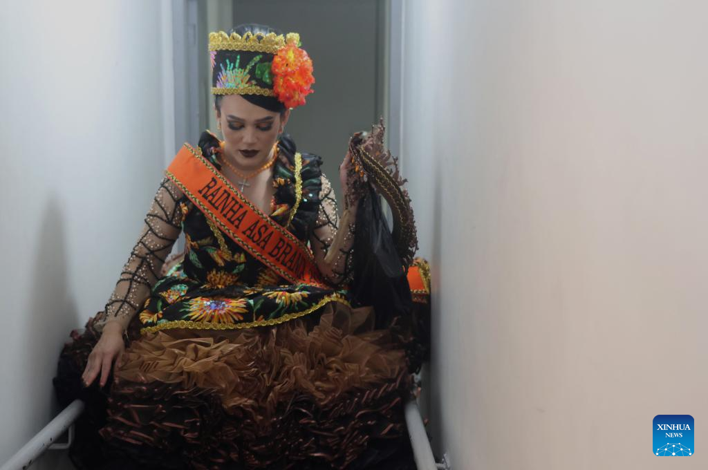 SAO PAULO, 9 junio, 2024 (Xinhua) -- Imagen del 8 de junio de 2024 de una artista preparándose para realizar una presentación durante el evento "Sao Joao de Nois Tudim" como parte de las celebraciones de la Fiesta de Junio llevadas a cabo en todo el país durante ese mes, en Sao Paulo, Brasil. (Xinhua/Rahel Patrasso)