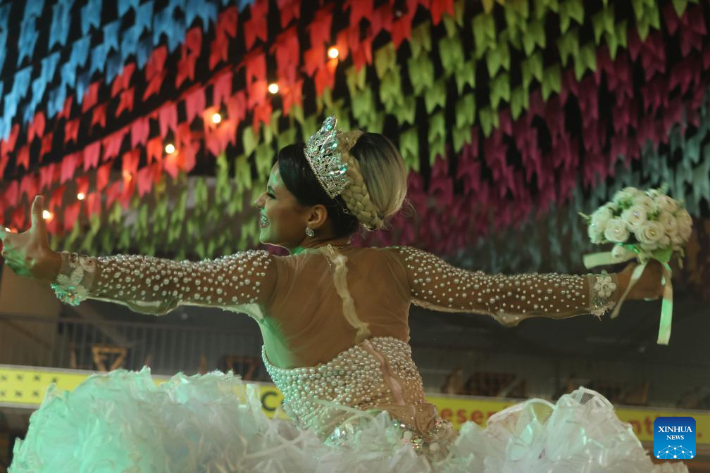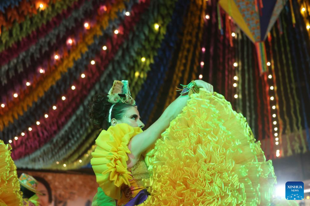 SAO PAULO, 9 junio, 2024 (Xinhua) -- Imagen del 8 de junio de 2024 de una artista realizando una presentación durante el evento "Sao Joao de Nois Tudim" como parte de las celebraciones de la Fiesta de Junio llevadas a cabo en todo el país durante ese mes, en Sao Paulo, Brasil. (Xinhua/Rahel Patrasso)