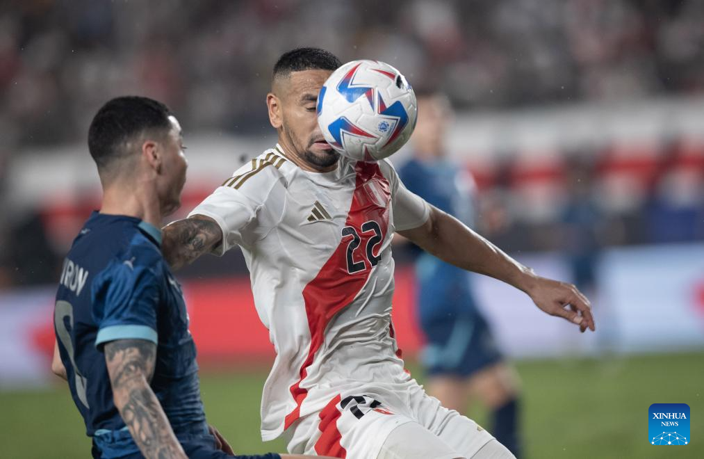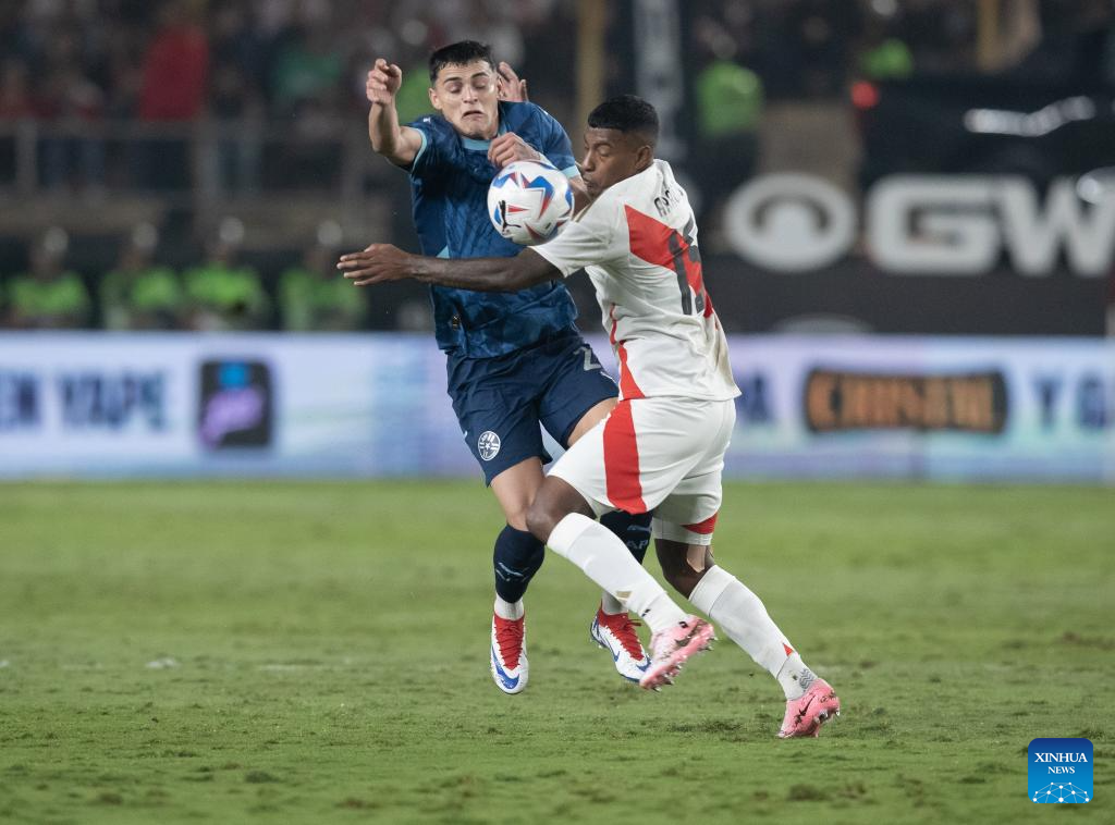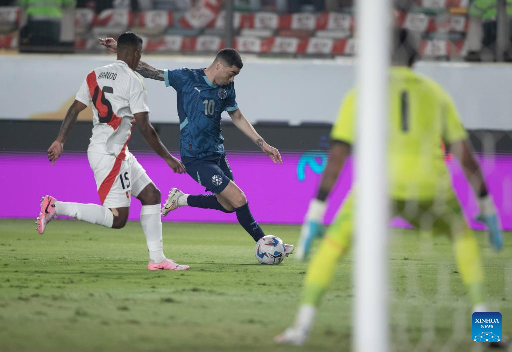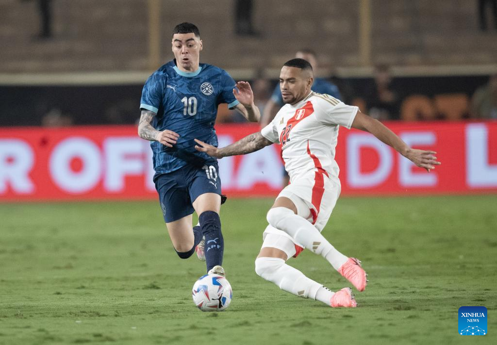 LIMA, 8 junio, 2024 (Xinhua) -- Imagen del 7 de junio de 2024 de Miguel Araujo (d), de Perú, disputando el balón con Ramón Sosa (i), de Paraguay, durante el partido amistoso previo a la Copa América, celebrado en el estadio Monumental, en Lima, Perú. (Xinhua/Mariana Bazo)