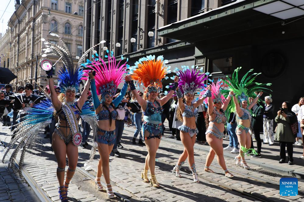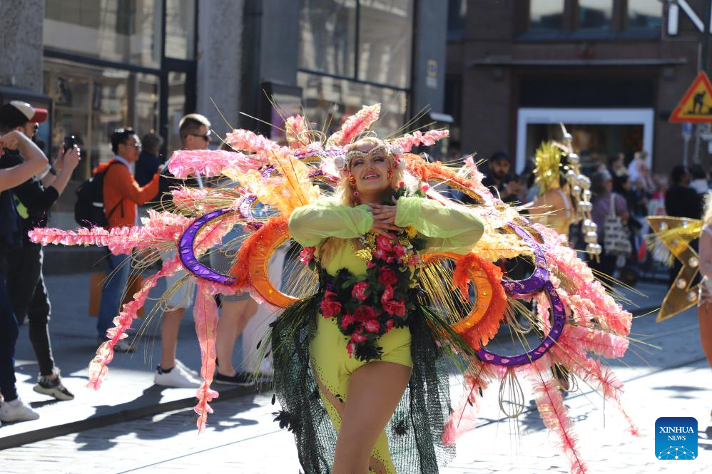 HELSINKI, 9 junio, 2024 (Xinhua) -- Imagen del 8 de junio de 2024 de artistas realizando una presentación en un desfile durante el Festival de Samba, en Helsinki, Finlandia. El carnaval alcanzó su clímax con un desfile de samba el sábado. (Xinhua/Chen Jing)