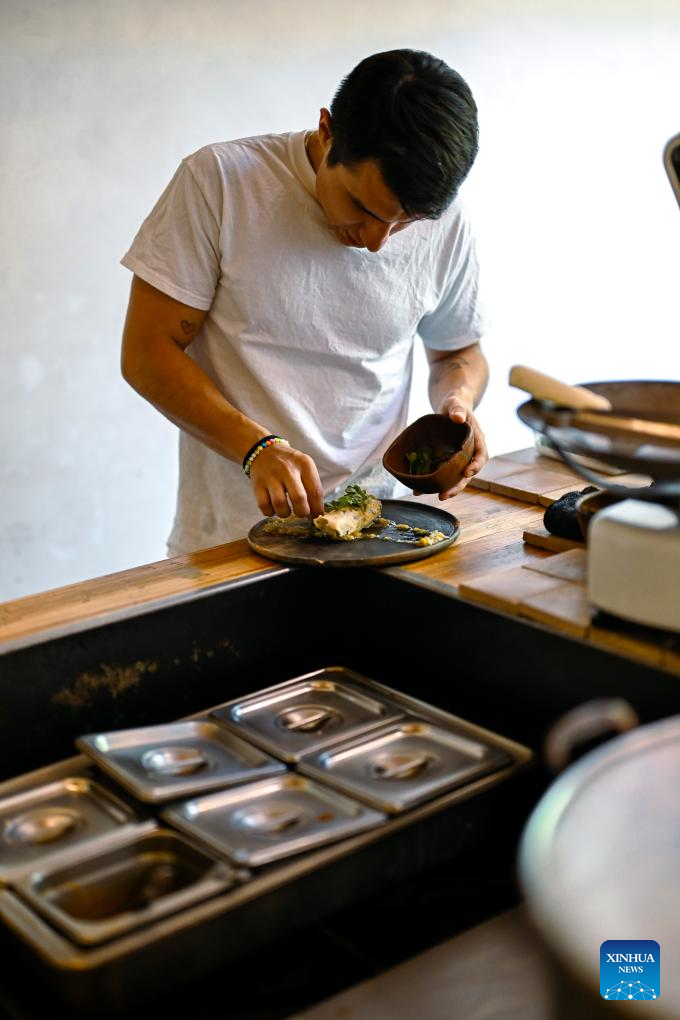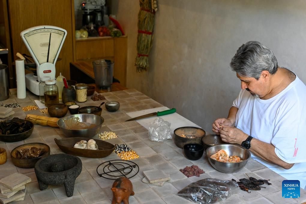 CIUDAD DE MEXICO, 9 junio, 2024 (Xinhua) -- Imagen del 8 de junio de 2024 de Rubén Amador Reyes, maestro cocinero del restaurante Tamales Madre, preparando la salsa de los tamales, en la Ciudad de México, capital de México. Los tamales son un platillo popular en México. Como muchos otros alimentos en México, los tamales tienen sus orígenes hace cientos de años, mucho antes de la llegada de los españoles. Las comunidades indígenas de México disfrutaban de este alimento básico en sus dietas, hecho con harina de maíz rellena de carnes y salsas, envuelta y cocida al vapor en hojas de maíz u hojas de plátano. (Xinhua/Li Muzi)