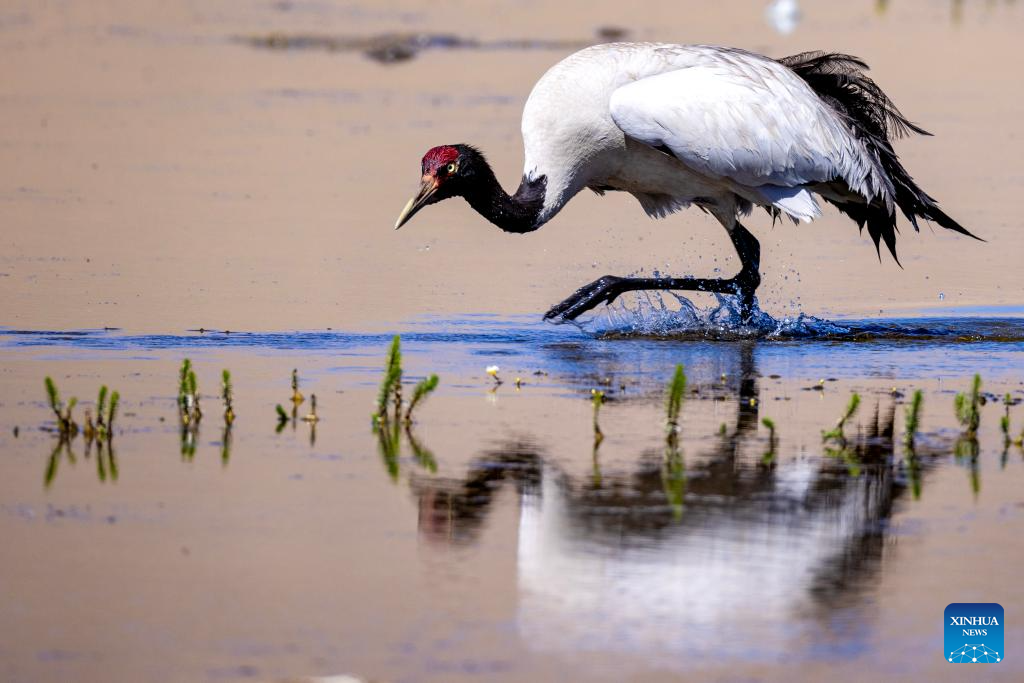 LHASA, 10 junio, 2024 (Xinhua) -- Imagen del 9 de junio de 2024 de una grulla de cuello negro alimentándose en un humedal, en el distrito de Xainza de la ciudad de Nagqu, en la región autónoma de Xizang, en el suroeste de China. Las parejas de grullas de cuello negro están criando bebés en humedales a una altitud de unos 4.700 metros en el distrito de Xainza. Cada año, alrededor de junio, las parejas de grullas de cuello negro migran al distrito de Xainza para incubar huevos en pilares de hierba rodeados de agua. La grulla de cuello negro, una especie que se encuentra bajo protección estatal de primera clase en China, habita principalmente en praderas de meseta y pantanos a una altitud de entre 2.500 y 5.000 metros. (Xinhua/Jiang Fan)