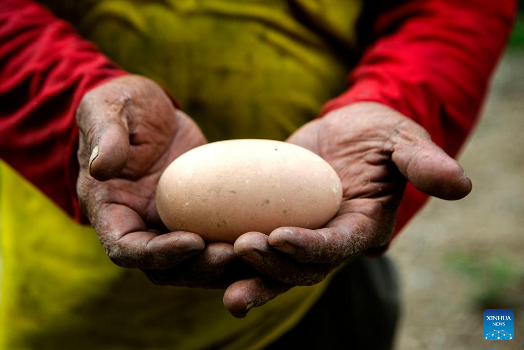 SULAWESI CENTRAL, 11 junio, 2024 (Xinhua) -- Imagen del 10 de junio de 2024 de un aldeano local mostrando un huevo de maleo en el Parque Nacional Lore Lindu, en Sulawesi Central, Indonesia. El maleo (Macrocephalon maleo) es endémico de la isla indonesia de Sulawesi y de la cercana isla de Buton, donde vive en bosques tropicales de tierras bajas y de montaña. Para proteger esta especie en peligro crítico, un grupo de aldeanos locales está creando un mejor entorno vital para el maleo construyendo hábitats e incubadoras cerca de sus lugares de anidación, recogiendo y protegiendo los huevos y liberando a los polluelos en la naturaleza. (Xinhua/Deden Isman)