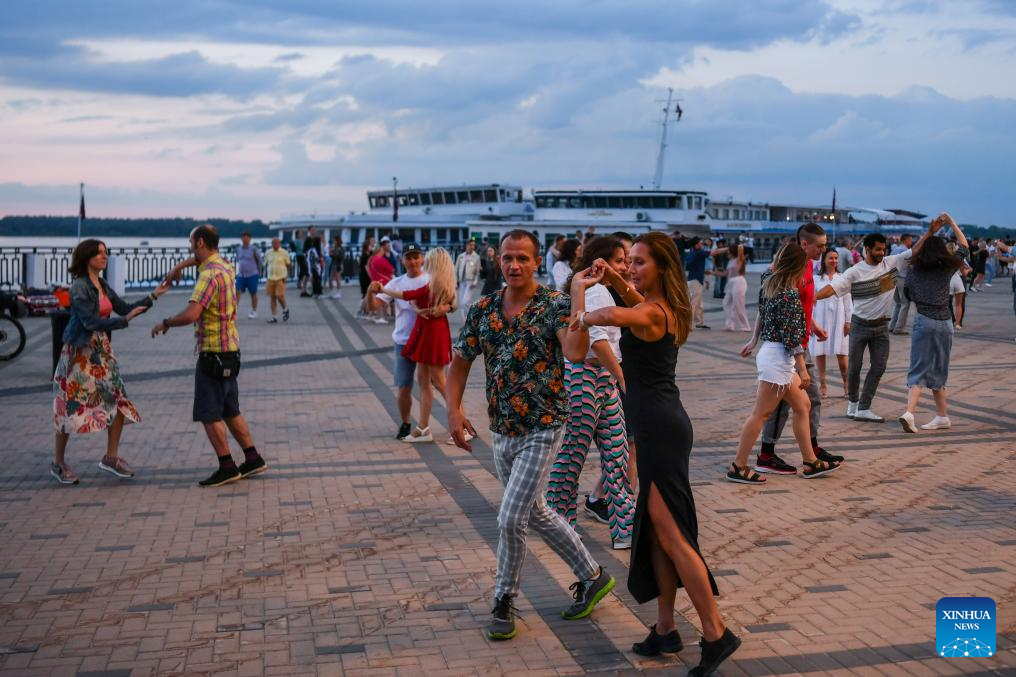 NIZHNY NOVGOROD, 11 junio, 2024 (Xinhua) -- Imagen del 9 de junio de 2024 de personas bailando en una calle junto al río, en Nizhny Novgorod, Rusia. (Xinhua/Cao Yang)