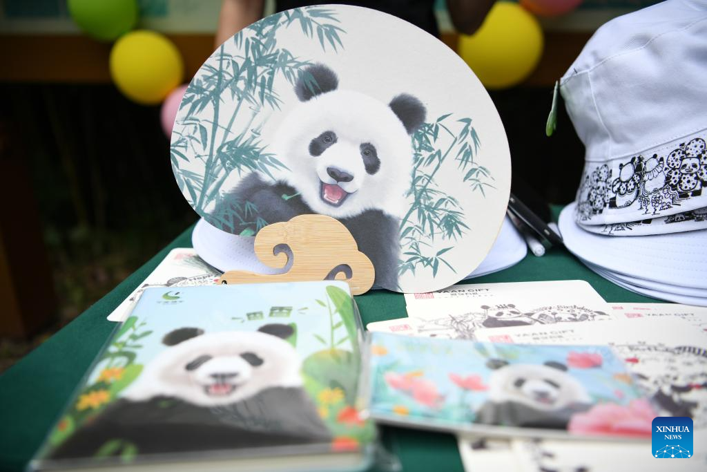 12 junio, 2024 (Xinhua) -- Productos creativos con temática de la panda gigante, Xiang Xiang, son vistos en la base Ya'an del Centro de Conservación e Investigación para Pandas Gigantes de China, en la provincia de Sichuan, en el suroeste de China, el 12 de junio de 2024. Muchos visitantes asistieron a la base Ya'an del Centro de Conservación e Investigación del Panda Gigante de China en la provincia de Sichuan, en el suroeste de China, para celebrar el séptimo cumpleaños de la panda gigante hembra, Xiang Xiang, el miércoles. Xiang Xiang nació en el Zoológico de Ueno, en Tokio, Japón, el 12 de junio de 2017 de Shin Shin (hembra) y Ri Ri (macho), dos pandas gigantes prestados por China, país al que pertenece la propiedad de los cachorros procreados por la pareja. La panda partió del Zoológico de Ueno, el 21 de febrero de 2023 y voló de regreso a China, su país de origen. (Xinhua/Xu Bingjie)