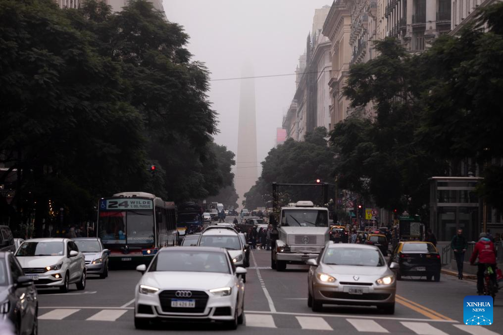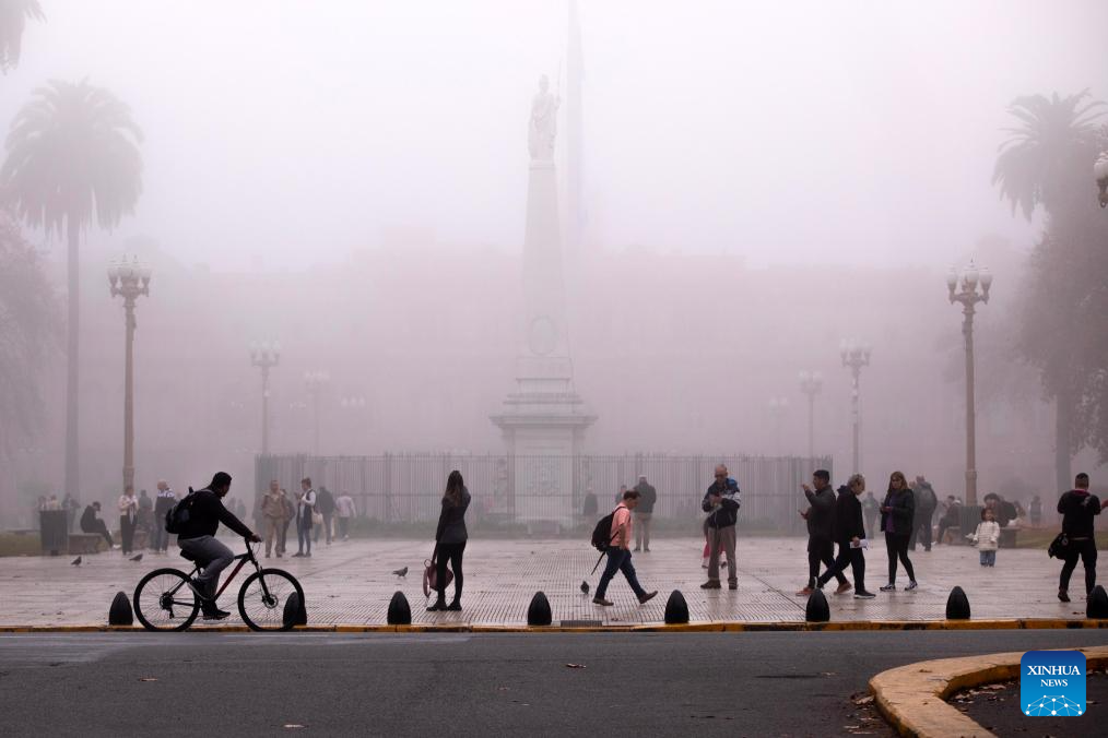 BUENOS AIRES, 12 junio, 2024 (Xinhua) -- Personas caminan bajo una densa niebla en la Plaza de Mayo, en la ciudad de Buenos Aires, capital de Argentina, el 12 de junio de 2024. (Xinhua/Martín Zabala)