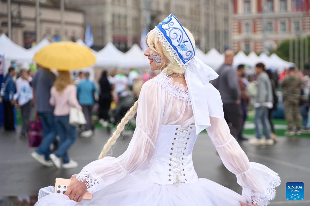 VLADIVOSTOK, 12 junio, 2024 (Xinhua) -- Una joven con un traje tradicional baila durante la celebración del Día de Rusia, en Vladivostok, Rusia, el 12 de junio de 2024. El Día de Rusia marca la fecha en que el Primer Congreso de Diputados del Pueblo de la Federación Rusa adoptó la Declaración de Soberanía Nacional de Rusia en 1990. (Xinhua/Guo Feizhou)