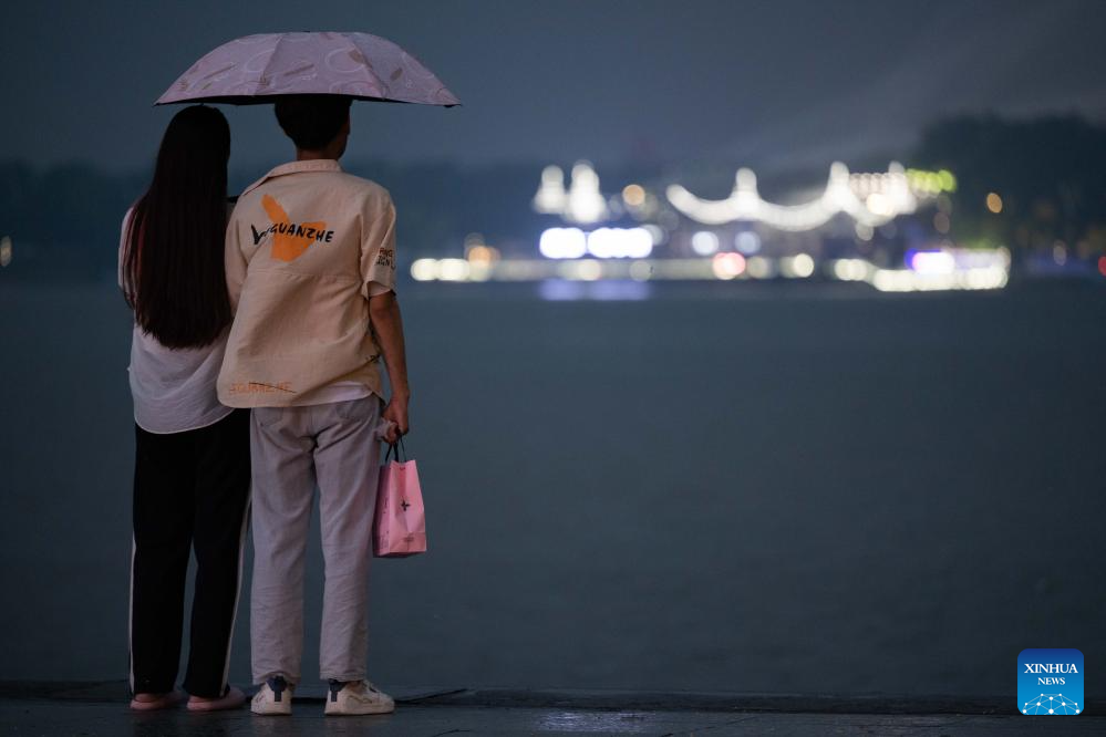 HARBIN, 12 junio, 2024 (Xinhua) -- Imagen del 11 de junio de 2024 de una pareja disfrutando de la vista del río alrededor del Monumento de Control de Inundaciones a lo largo del río Songhua, en Harbin, en la provincia de Heilongjiang, en el noreste de China. (Xinhua/Xie Jianfei)