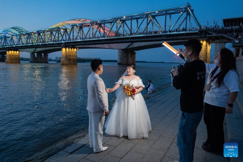 HARBIN, 12 junio, 2024 (Xinhua) -- Imagen del 4 de junio de 2024 de una pareja posando para fotografías de boda a lo largo del río Songhua, en Harbin, en la provincia de Heilongjiang, en el noreste de China. (Xinhua/Xie Jianfei)