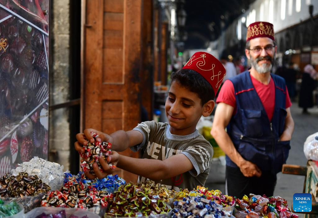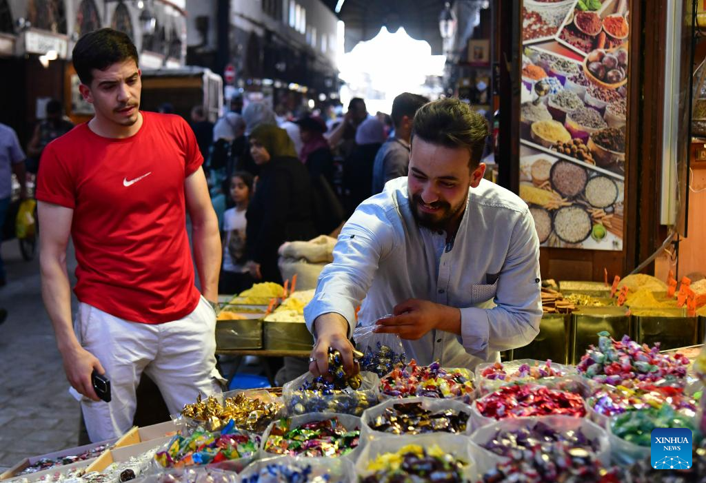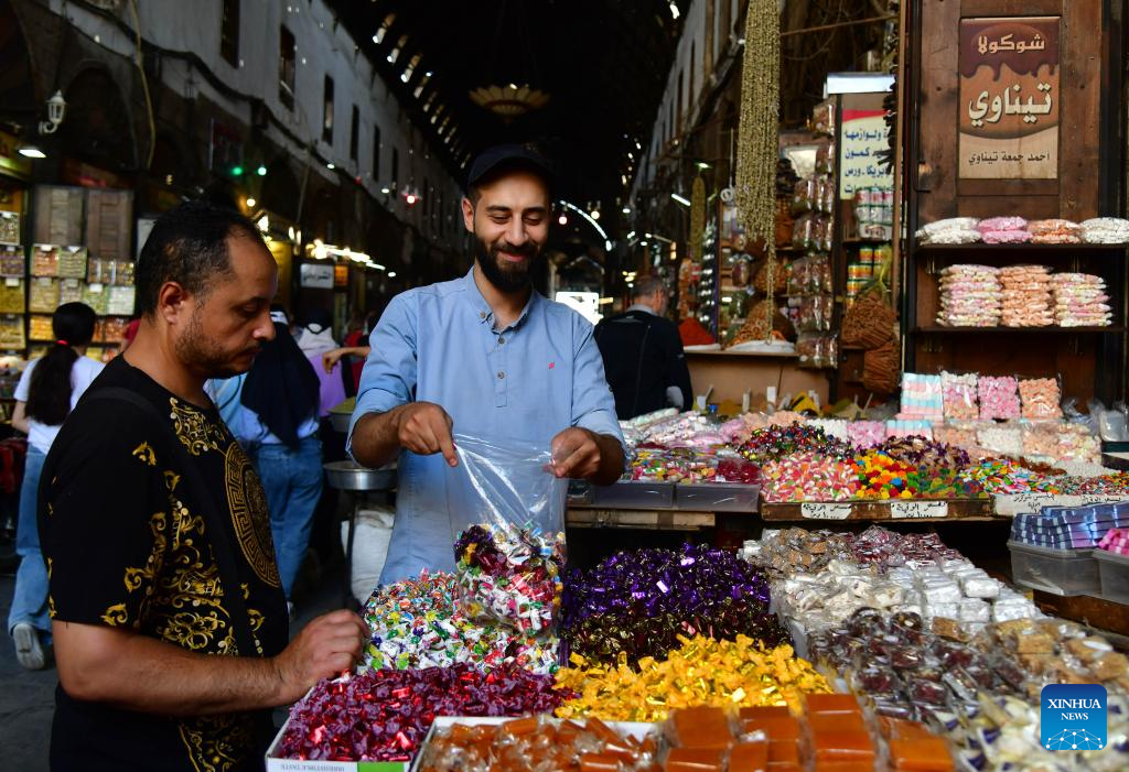 DAMASCO, 13 junio, 2024 (Xinhua) -- Imagen del 12 de junio de 2024 de personas comprando dulces para el próximo Eid al-Adha en Damasco, Siria. (Xinhua/Ammar Safarjalani)