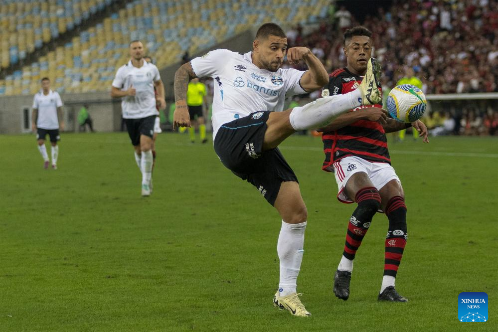 RIO DE JANEIRO, 14 junio, 2024 (Xinhua) -- Imagen del 13 de junio de 2024 del jugador Bruno Henrique (d), de Flamengo, disputando el balón con Joao Pedro (i), de Gremio, durante el partido correspondiente a la jornada 8 del Campeonato Brasileño Serie A, celebrado en el Estadio Maracaná, en Río de Janeiro, Brasil. (Xinhua/Claudia Martini)