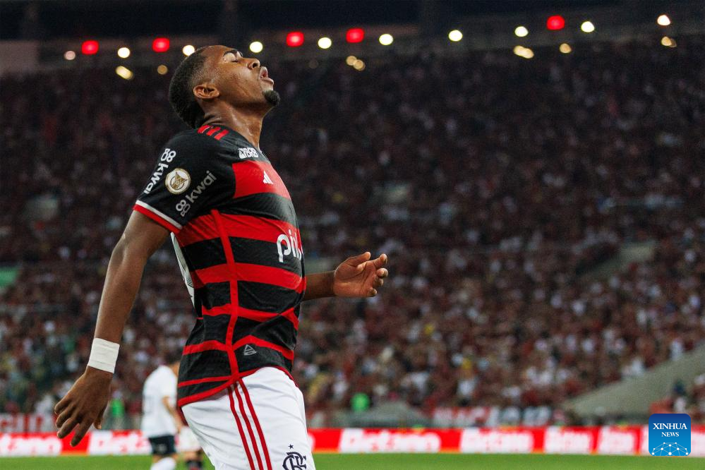 RIO DE JANEIRO, 14 junio, 2024 (Xinhua) -- Imagen del 13 de junio de 2024 del jugador Luiz Araújo, de Flamengo, festejando su anotación durante el partido correspondiente a la jornada 8 del Campeonato Brasileño Serie A, ante Gremio, celebrado en el Estadio Maracaná, en Río de Janeiro, Brasil. (Xinhua/Claudia Martini)